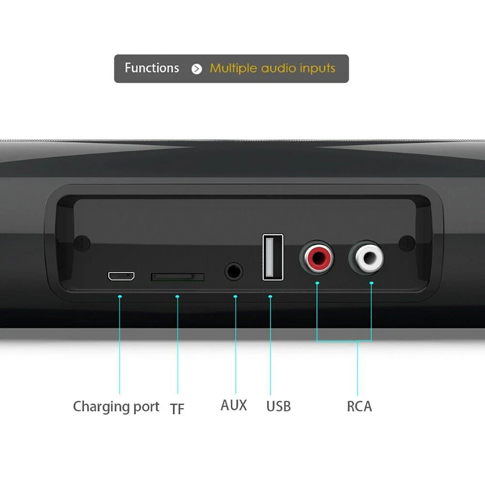 Product Description Bluetooth 5.0 Home TV Sound Bar Speaker System Wireless Subwoofer 3D Surround Feature: 1. Bluetooth 5.0 Technology: Compatible with most Bluetooth-enabled devices, connect to your smart phone instantly. And the transmission distance up to 10 meters. 2. Multiple Connection Methods: Not only come with Bluetooth function, but also support TF card, U disk, RCA,AUX playback, and support FM radio. Support A2DP, AVRCP, HSP and HF format. 3. Excellent Sound Quality: Adopted the newest configurations, this Soundbar has 4*10W built-in speakers and Bluetooth 5.0 chipset, which means it can produce greater bass and excellent sound performance. Four speakers for high performance multi-dimensional sound and an unparalleled cinematic deep bass surround sound, let you enjoy high-quality music. Watching TV at home is like watching a movie at a movie theater. It gives you a theater level sound experience. 4. Elegant Design & Long Battery Life: With the 2000mAh built-in battery (charged by USB cord included), the speaker can play music for 4H when it is fully charged. And the standby time up to 240 Hours. Just enjoy the music without needing to worry the battery. 5. High Quality: Made of high quality metal mesh material, it can effectively prevent music distortion and block external noise. 6. 6 Kinds of Sound Effects: 6 kinds of sound effects can be switched at will. To meet different sound quality needs. 7. Equipped With A Remote Control: You can remotely control the speaker and switch the sound effect through the remote control. 8. TWS Function: TWS technology allows you to pair two bluetooth speakers by wireless Bluetooth, then audio can be played in sync on two speakers (as left/right channel outputs respectively), for true double enhanced stereo sound. The 4*10W drivers enhance the bass and provide more louder sound, which will crash the party or dancing. 9. Hands-free Call: With stable bluetooth connect, nothing will get in the way between you and your phone call. Hands-free calling havenever been easier. Specifications: Item Type: Bluetooth Speaker Material: metal + plastic Waterproof rating: IPX 4 Expansion storage: 32G Bluetooth Version: 5.0 Color: Black Speaker Power: 4 * 5w Use Transmit Power: 1.49mw Transmission Frequency: 2.48ghz Transmission Distance: 10 Meters Music Playback Time: About 8 hours Supported Formats: A2DP, AVRCP, HSP AND HF Battery: 3.7V / 2000MA Signal To Noise Ratio: -80db Frequency Response: 20hz-20khz Charging Voltage: Dc 5v / 1a-2a Charging Socket: Micro USB Size: 560 x 62 x 62mm / 22.05 x 2.44 x 2.44 inch Package included: 1 * Bluetooth Speaker 1 * Remote Control 1 * Charging Cable 1 * RCA Cable 1 * User Manual About Us Shipping Terms Returns Contact Us About Item All items sold by us are being described to the best of our abilities, as accurate as possible, and with utmost conscientiousness on our part. However, to avoid any potential oversights, I respectfully request your assistance in helping us to make this a mutually satisfactory transaction by THOROUGHLY reviewing item description and photos, and asking all questions PRIOR TO BIDDING. Customer Satisfactory 1.We back our commitment with superb service, 100% full money back and a customer satisfaction guarantee. 2.I am here and ready to assist you with any questions or concerns you might have before or after the purchase. 3.My goal is to make sure you are a happy customer and pleasant shopping with us. Feedback If you are satisfied with the purchase and our total service, your comment is very important in our business success. Please take a minute to leave us a positive feedback with an overall Detailed Selling Rating (DSR) of 5. Our eBay account setup auto feedback, so eBay system gives you automatically Positive feedback back after your positive feedback left. IF YOU PLAN TO GIVE US A NEUTRAL/NEGATIVE FEEDBACK OR OPEN EBAY/PAYPAL CASE, PLEASE WRITE TO US IMMEDIATELY SO THAT WE CAN DO OUR BEST TO RESOLVE YOUR PROBLEM. United States Buyers Same business day free shipping within United States All orders will be shipped through USPS First Class, UPS and Fedex depends on the weight of the items. Shipping Time Usually ,Parcel will be delivered 2-5 working day include Handling time. Sometimes shiping time may has a little delay, such as Bad wether,Holidays We stand behind everything that we sell and will do everything possible to assure you are satisfied. When you receive your purchase if you are not 100% satisfied, please sent me ebay message and we will do our best to make you happy. If you still want to return your purchase, simply ship the item(s) back to us and we will refund your original purchase price and the original shipping charge. Buyers are responsible for the postal cost of returning the items. We must be notified of the intent to return your item within 30 days of receiving the item. Items returned must be in the same condition that they were received. How to return 1,Please ask us for return address . 2,Shipping back the package . The RMA#(Return Merchant Authorization Number = Your ebay ID) must be clearly written on the return package ,Otherwise the package will be refused. 3,Sent us the return tracking number. 4,All returns will be inspected prior to a credit being issued. 1:Returns are accepted within 60 days of purchase. 2:All returned items MUST BE in the original packaging. 3:We will be happy to assist you if if any item needs to be returned or replaced 4:Please don't open a return request before contacting us first to solve, many thanks. Sent ebay message in English If you have any questions, our Customer Service staffs welcome you to sent me ebay message. We strive to answer all questions and resolve any problems as quickly as possible. Business Hours: Monday-Saturday 9:00-17:00 About Us About Item All items sold by us are being described to the best of our abilities, as accurate as possible, and with utmost conscientiousness on our part. However, to avoid any potential oversigh