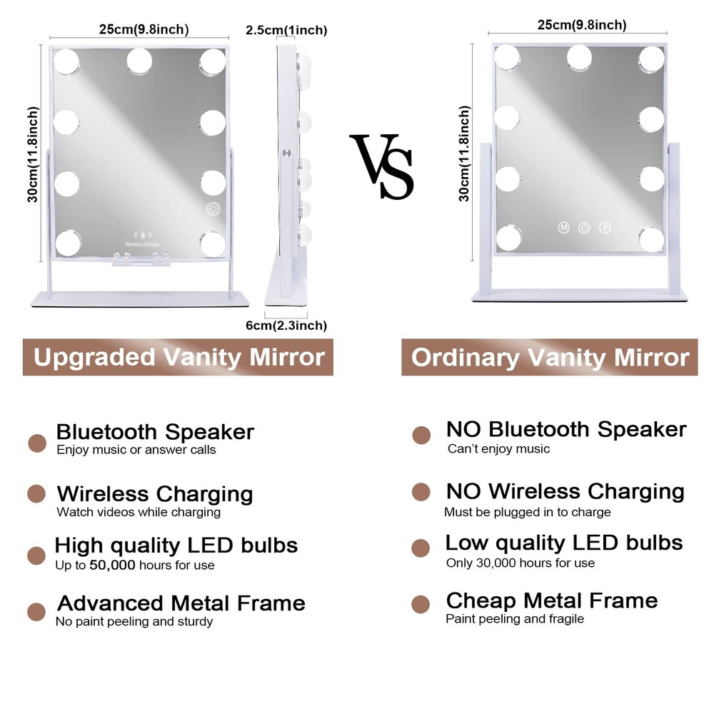 【 3 Colors Lighting Modes 】This LED makeup mirror provides 3 colors lighting modes, warm lights/natural lights/cool lights also can be dimmed or brightened to meet your different makeup needs, no matter it is early morning or late night. 【 Bluetooth Speaker】Bluetooth Speaker is on the back of lighted makeup mirror, you can enjoy music or answer calls when making up. 【 Wireless Charging 】With a phone holder, the wireless charging part of makeup mirror is suitable for all Qi mobile phones. Not only can it be charged, but you can also watch videos or tutorials while applying makeup 【 Detachable 10X Magnifying Mirror 】Our light up makeup mirror has 10X magnifying mirror to help applying mascara, eyeliner, eyebrow and lipstick, creating flawless 【 Perfect Size 】The size of tabletop mirror for makeup is 12''x10'', allows you to get your entire face in view at once but spare more space for your vanity desk. The 9 LED globe bulbs can be used continuously with 50,000 hours life span. It is very durable without changing the bulb. 【 Best Present and Warm-tip 】 This hollywood vanity mirror lights as a perfect present for any teen Girls/Ladies on birthday/christmas. We're so confident in the quality of our lighted mirror for makeup. Please feel to contact us if you have any product problems.