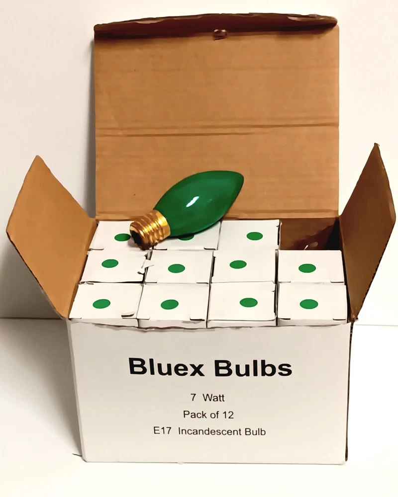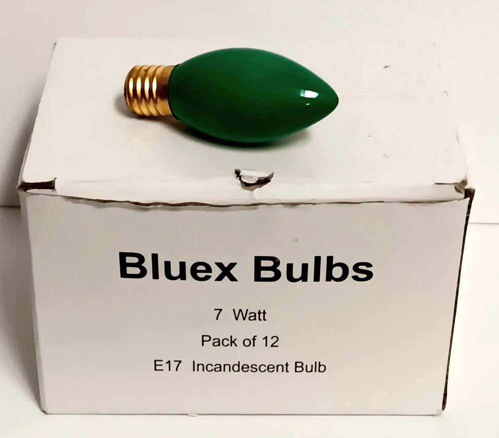 Bluex C9 Green Bulbs 7 Watt 12 Piece LED Christmas & Candle Lights Replacement Open Different Box. Unused. See photos.