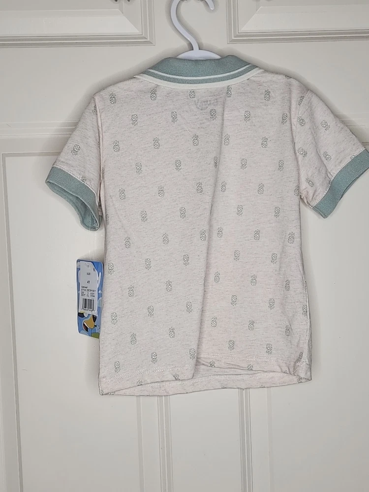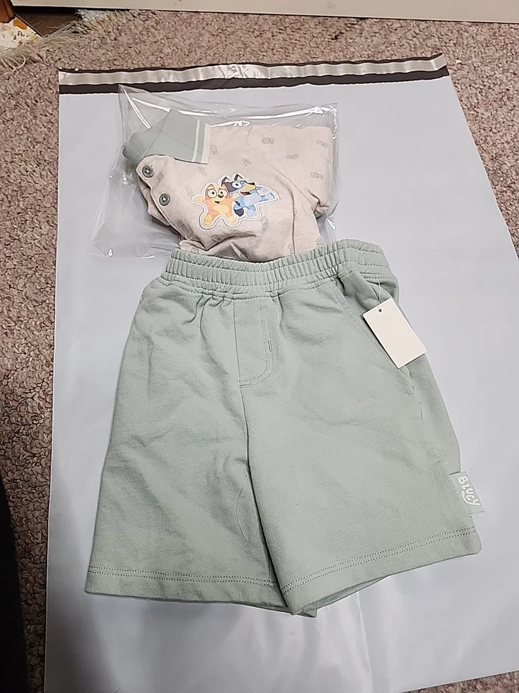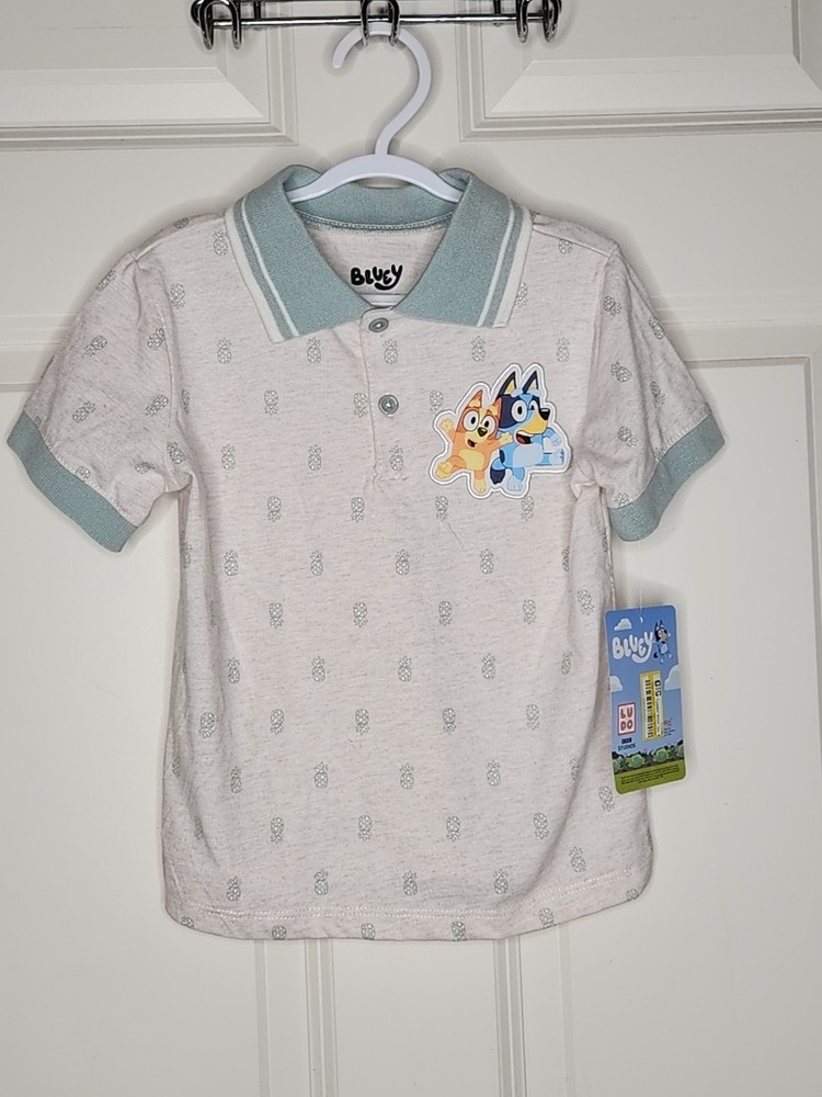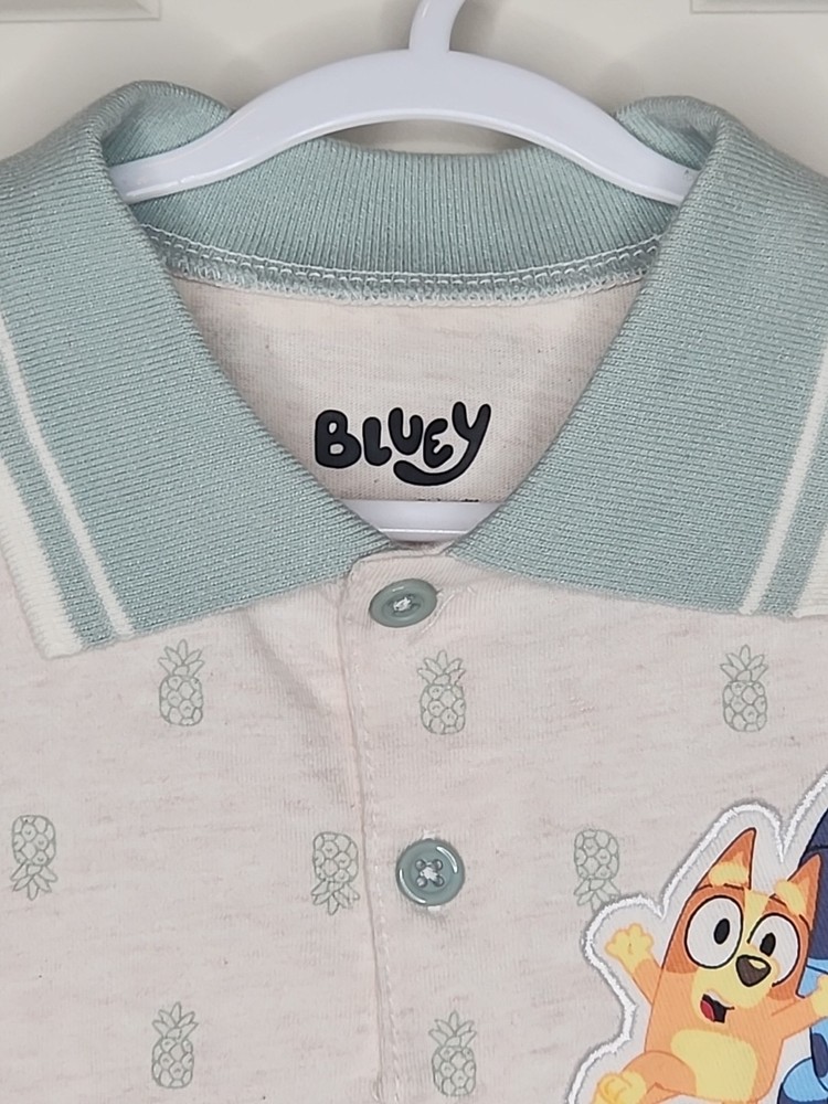 Nwt collared tshirt bluey embroidered logo on chest , cream and sage green in color , buttons , sweatpant material elastic waist shorts in green with pockets . see all pictures for details nwt
