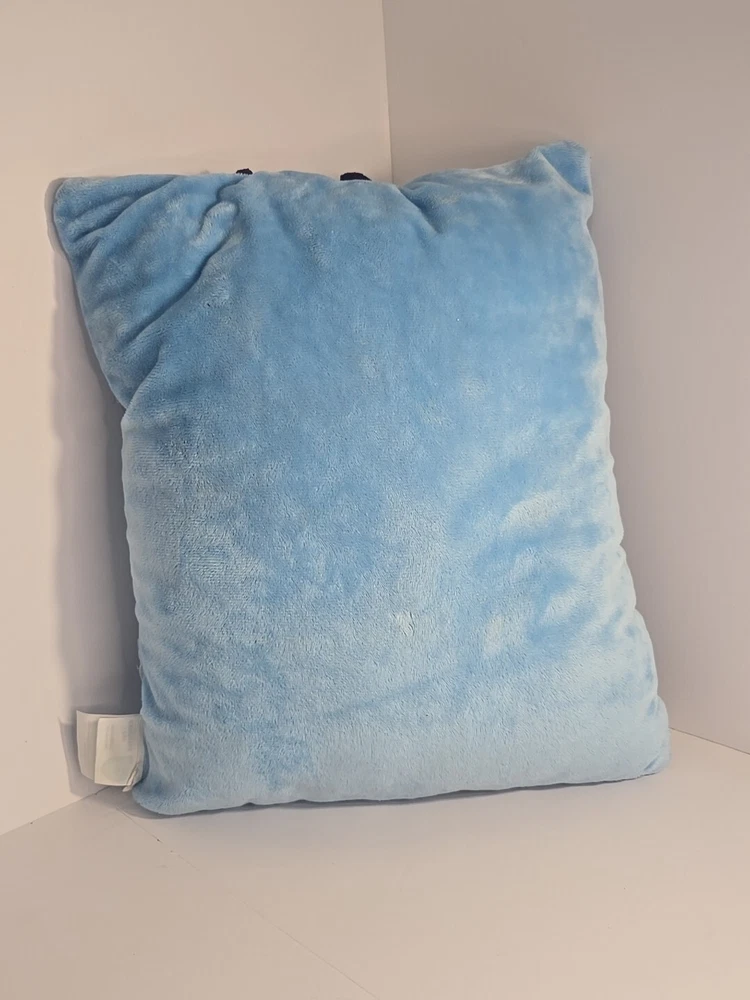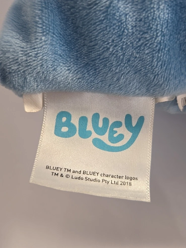 A Ludo Bluey Bedtime Pal plushie pillow, featuring a 3D character design of a blue dog. This medium-sized (20"x14") pillow buddy is made of 100% polyester, offering a soft and cuddly feel. Ideal for children aged 4-7, it is recommended for ages 4 and up. The plushie is vacuum sealed for shipping and was manufactured in China in 2018. Perfect for winter snuggles, this adorable Bluey pillow is sure to be a favorite companion for young fans.