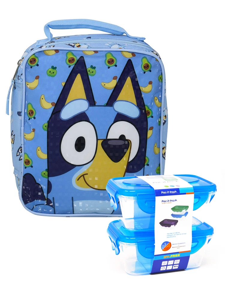 OFFICIALLY LICENSED | UNIQUE APPAREL AND ACCESSORIES | 100% AUTHENTIC | FREE STANDARD SHIPPING | HASSLE-FREE RETURNS HOME JUNIORS WOMEN PLUS SIZE MEN KIDS TOTE BAGS BACKPACKS DISNEY Bluey Insulated Lunch Bag & 2-Piece Food Container Set Boys Girls Reusable Product Details Bluey is ready to keep your lunch cool and secure while at school, camp or on the go! This Bluey insulated lunch bag will be your little ones' favorite lunch bag! Set Includes: (1) Bluey Reusable Insulated Lunch Bag & (1) 2-Piece 250ML Food Container Set. Bluey Lunch Bag features a large vibrant graphic print of Bluey with her ears standing up! Includes main insulated compartment with zipper closure. Easy carry with padded carry handle. The spacious interior keeps all her food, snacks, and fruits fresh and secure. Measures approximately in inches: 8"W x 9.5"H x 3"D Officially licensed Bluey merchandise. (2 Count) Pac-It Fresh Snack Food Containers are clear plastic with a snap on/off removable lid that come in purple, green and blue. (Colors Vary and cannot be requested). Made of BPA-free Polypropylene plastic. Freezer-Safe and Dishwasher-Safe! Containers can stack inside each other for easy storage. Each container measures approximately 4" L x 3" W x 2" H. 250ml Not Recommended for Children under the age of 3. Brand Bluey Color Blue Material Polyester Style Height 9.500 Length 3.000 Width 8.000 LUNBA-77621-BDL CLICK HERE TO BROWSE ALL OUR ITEMS OR SHOP BY CATEGORY BELOW: MEN SHOP NOW WOMEN SHOP NOW PLUS SIZE SHOP NOW KIDS SHOP NOW BAGS & ACCESSORIES SHOP NOW SHOP BY BRANDS Quick Links Payment Details Shipping Details Returns About Us Contact Us Store Home Add to Favorites New Arrivals Ending Soon Feedback Payment Options Secure Payments by Store Newsletter Add Store to your Favorites and receive email newsletters about new items and special promotions! Sign Up Now Copyright © Open and Clothing