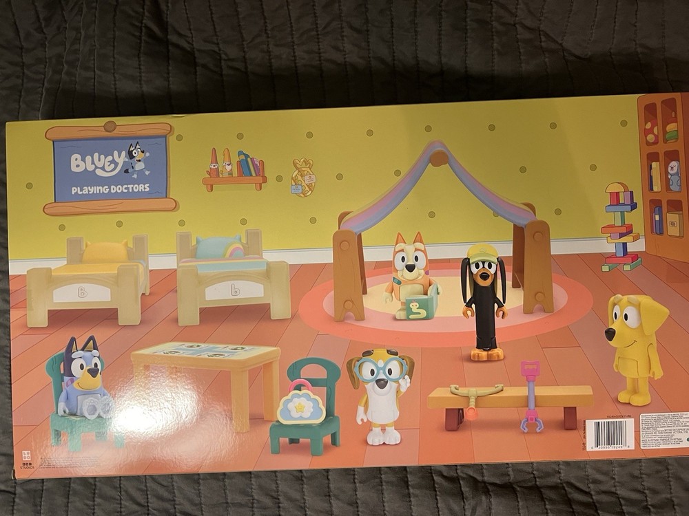 The Bluey Playing Doctors Value Box includes 5 figures and 11 accessories, perfect for imaginative play and developing storytelling skills. Suitable for children ages 3 and up, this set allows kids to create their own medical scenarios and embark on exciting adventures with Bluey and friends. Each figure and accessory is designed for interactive play, making it a fun and engaging toy for young fans of the popular show. The new sealed packaging ensures that the toy remains pristine for hours of playtime enjoyment.