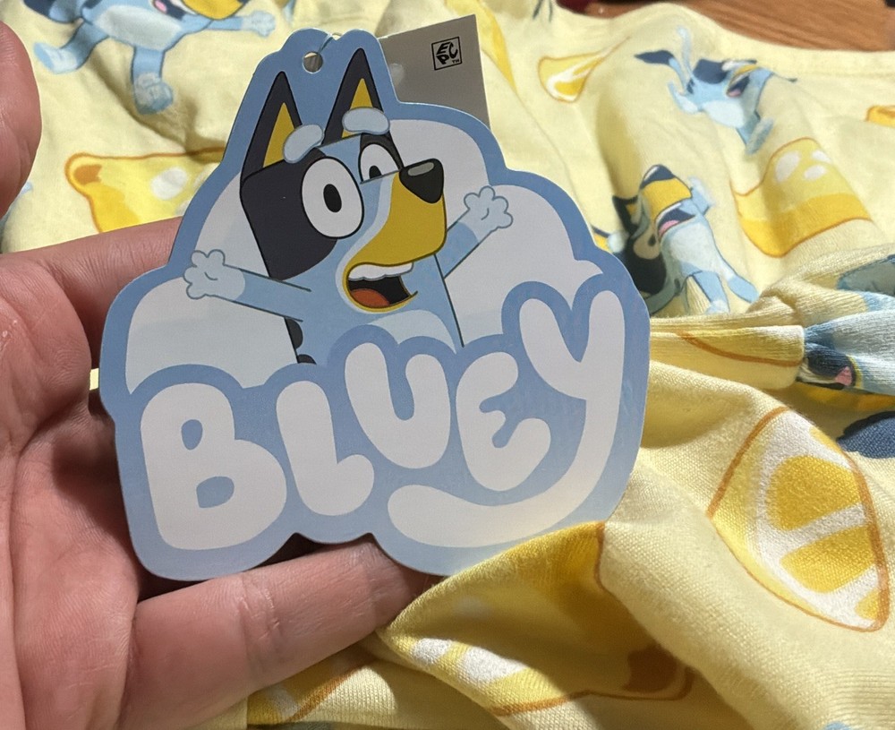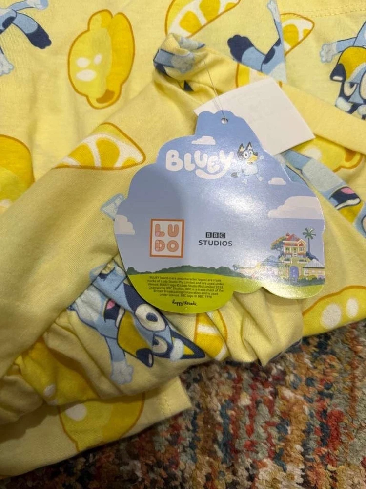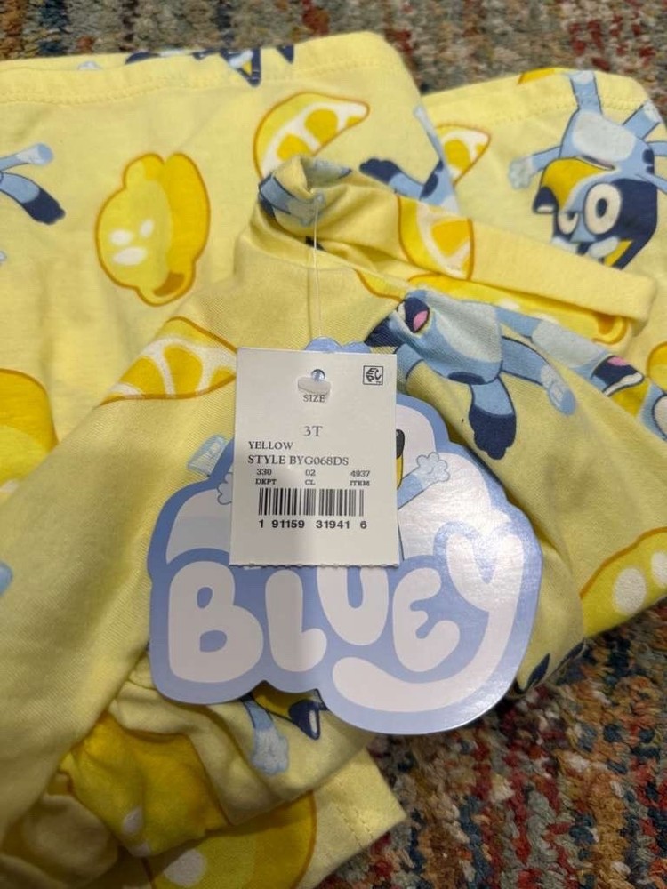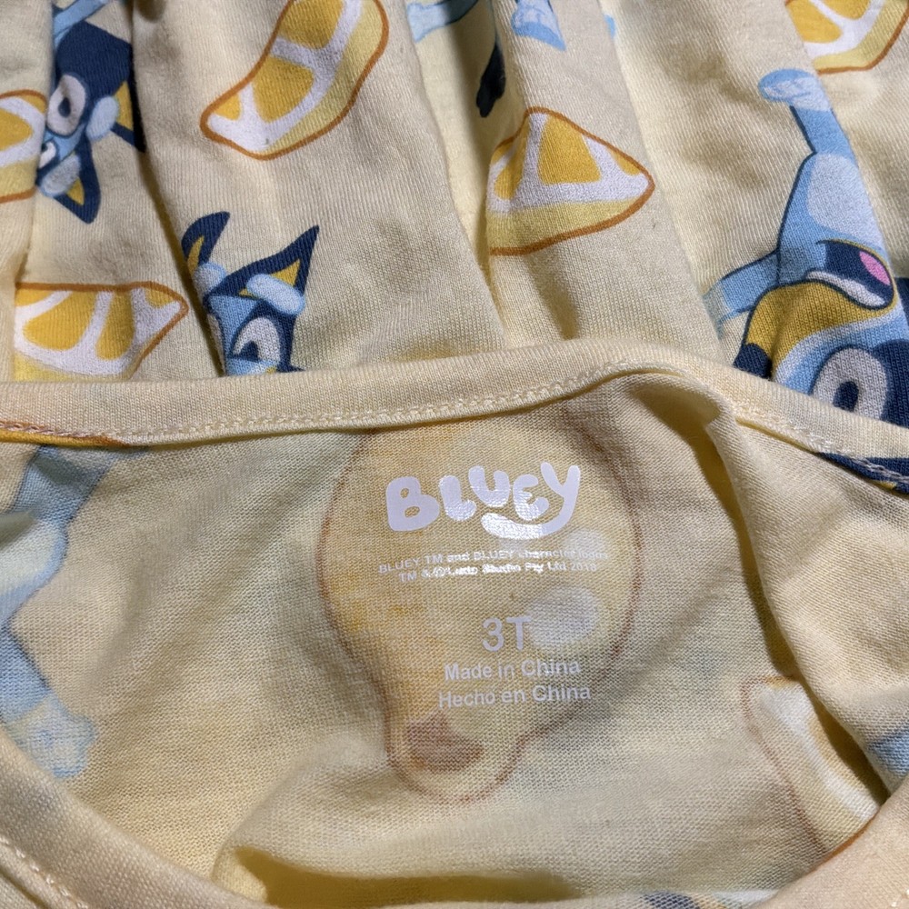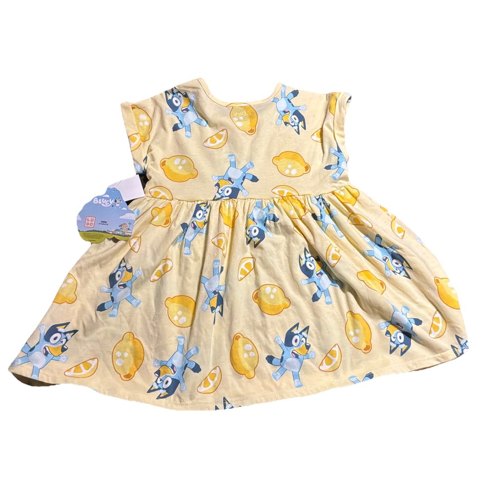 Adorable officially licensed Bluey toddler dress, perfect for everyday wear or a Bluey fan gift. This yellow dress features fun Bluey character graphics with lemon print throughout. Soft, lightweight fabric with a gathered skirt for comfort and easy movement. Brand new with original tags attached. Measurement: about 19 inch vertical and approximately 13 inch chest. #036