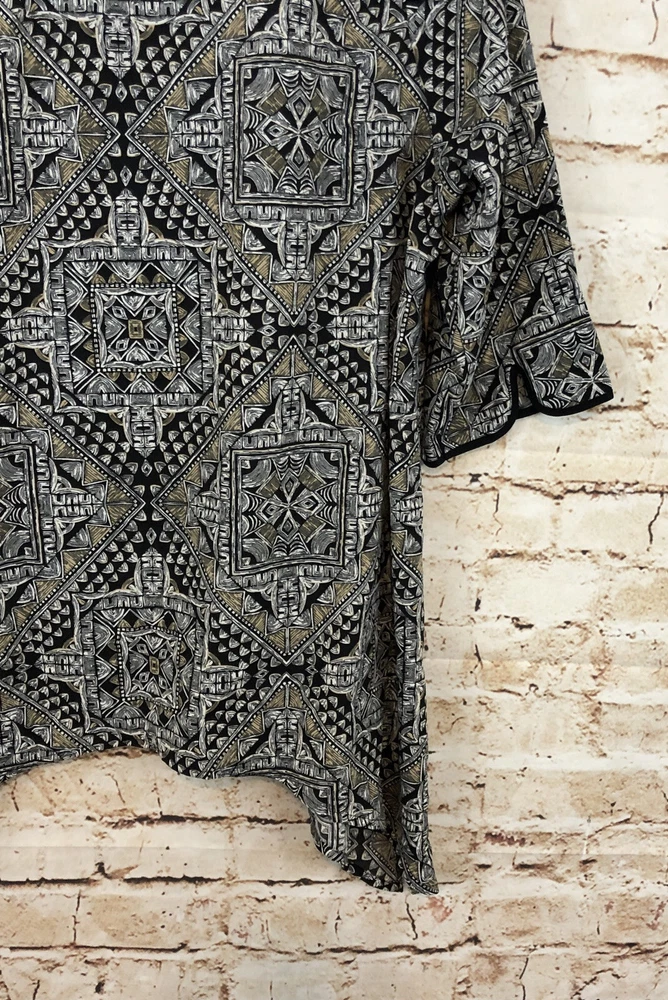 Catheirnes womens size 0X black print shirt top blouse cutout neck detail asymmetrical sharkbite hem button front 3/4 sleeve easy relaxed silhouette 95 cotton 5 spandex Gently pre-owned no flaws Measures approx: armpit to armpit: 23" length: 29"-34"