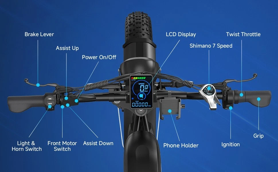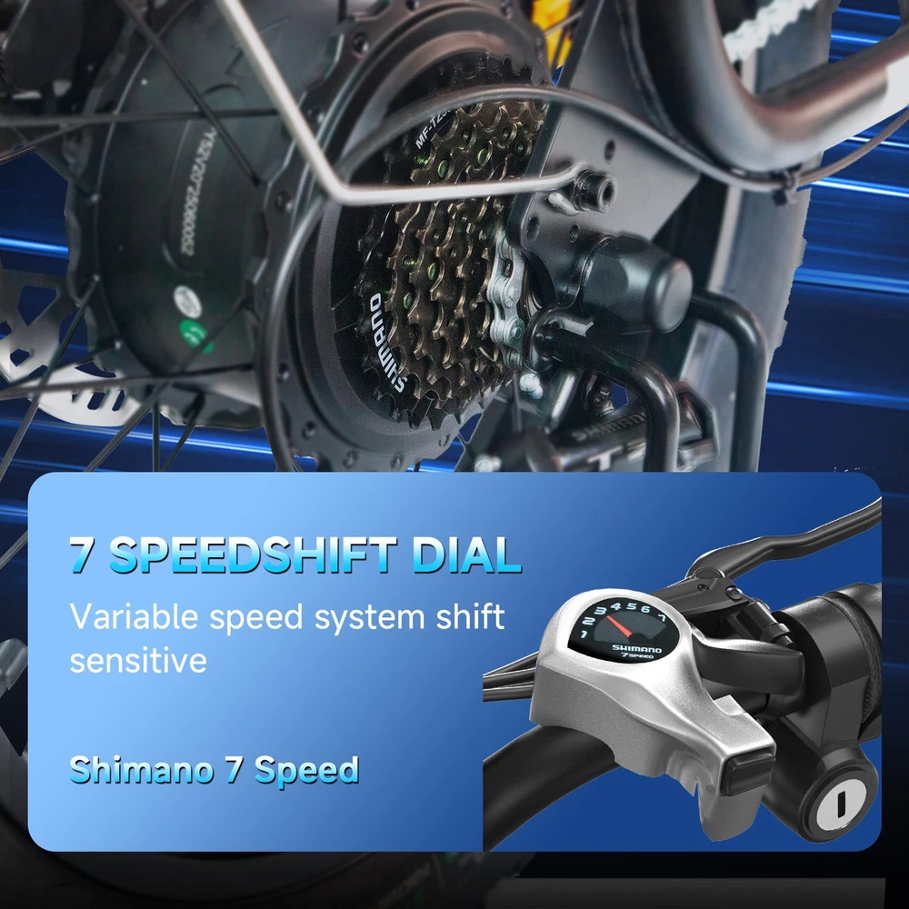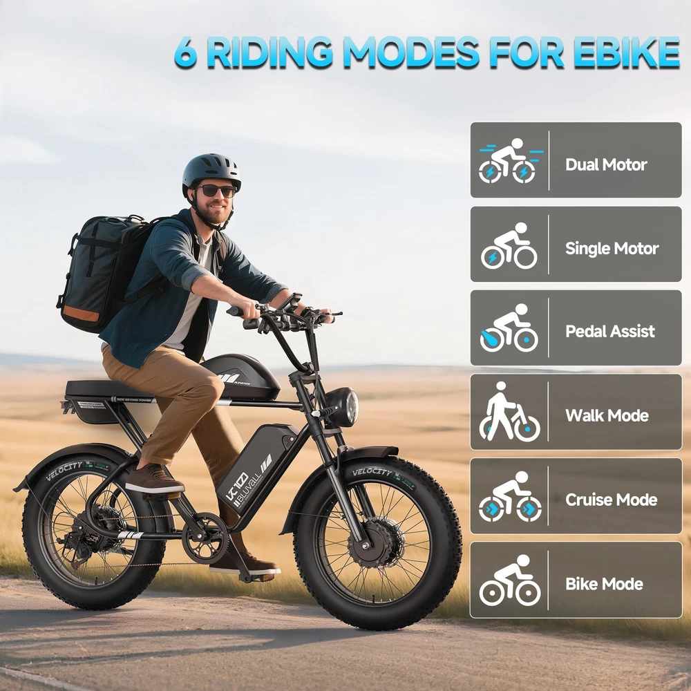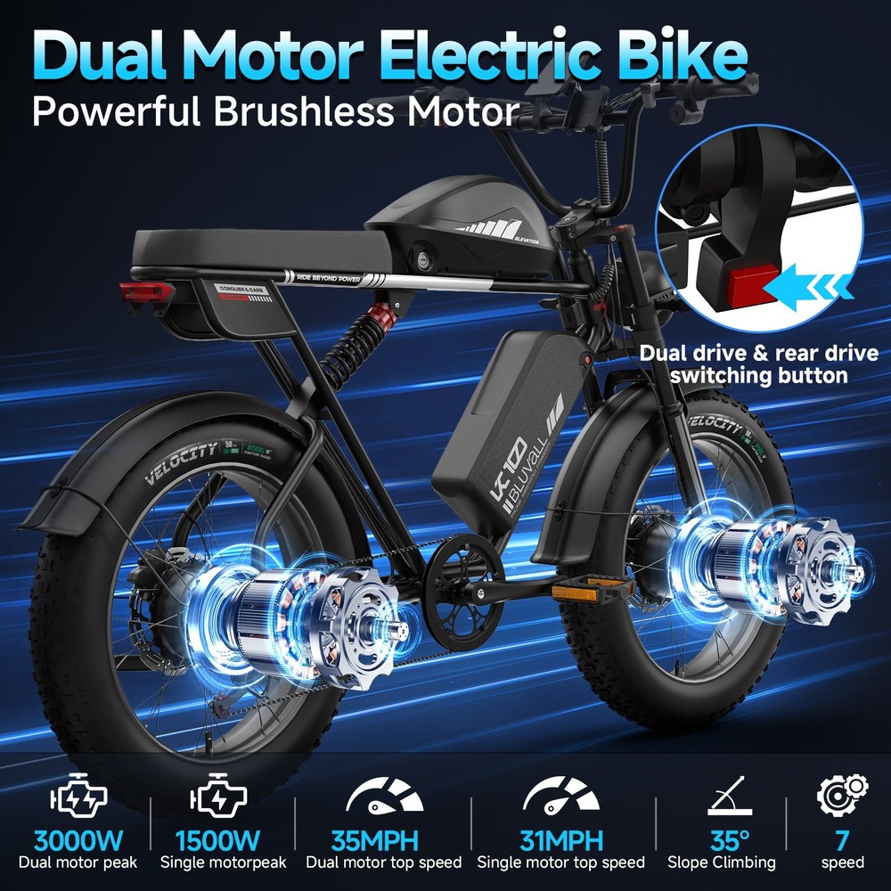 Shifter Style: Thumb Shifter Motor Power: Dual 52V 1000W Motors Country/Region of Manufacture: China Fork: Dual-Crown Suspension Fork Max Load: 330 lbs (150 kg) Maximum Speed: 37MPH Model Year: 2025 Display: Multifunctional LCD Display Wheel Size: 20 in Throttle: Twist Throttle Brand: Bluvall Number of Speeds: Shimano 7 Speed Maximum Range: 70-120 miles with pedal assist Department: Unisex Adults Motor Type: Dual Motors Suspension Type: Full Suspension (Front & Rear) Gear Change Mechanism: Derailleur Gears Model: K10 Material: Carbon Steel Tire Type: Fat Tires Voltage: 52V Frame Size: Large Battery: 52V 43AH Dual Lithium-ion Batteries Item Weight: 79 lb Bike Type: E-Mountain Bike Brake Type: Disc Brake - Hydraulic Charging Time: More Than 5 Hours Frame Number: K10 MPN: K10 Handlebar Type: Cruiser Bar 3 Modes: Pure Electric, Pedal-assist, Normal Bike, Cruiser Mode Manufacturer Warranty: 1 Year Features: Display, Fenders, Front Light, Kickstand, Lithium Ion Battery, Pedal Assist, Rear Light