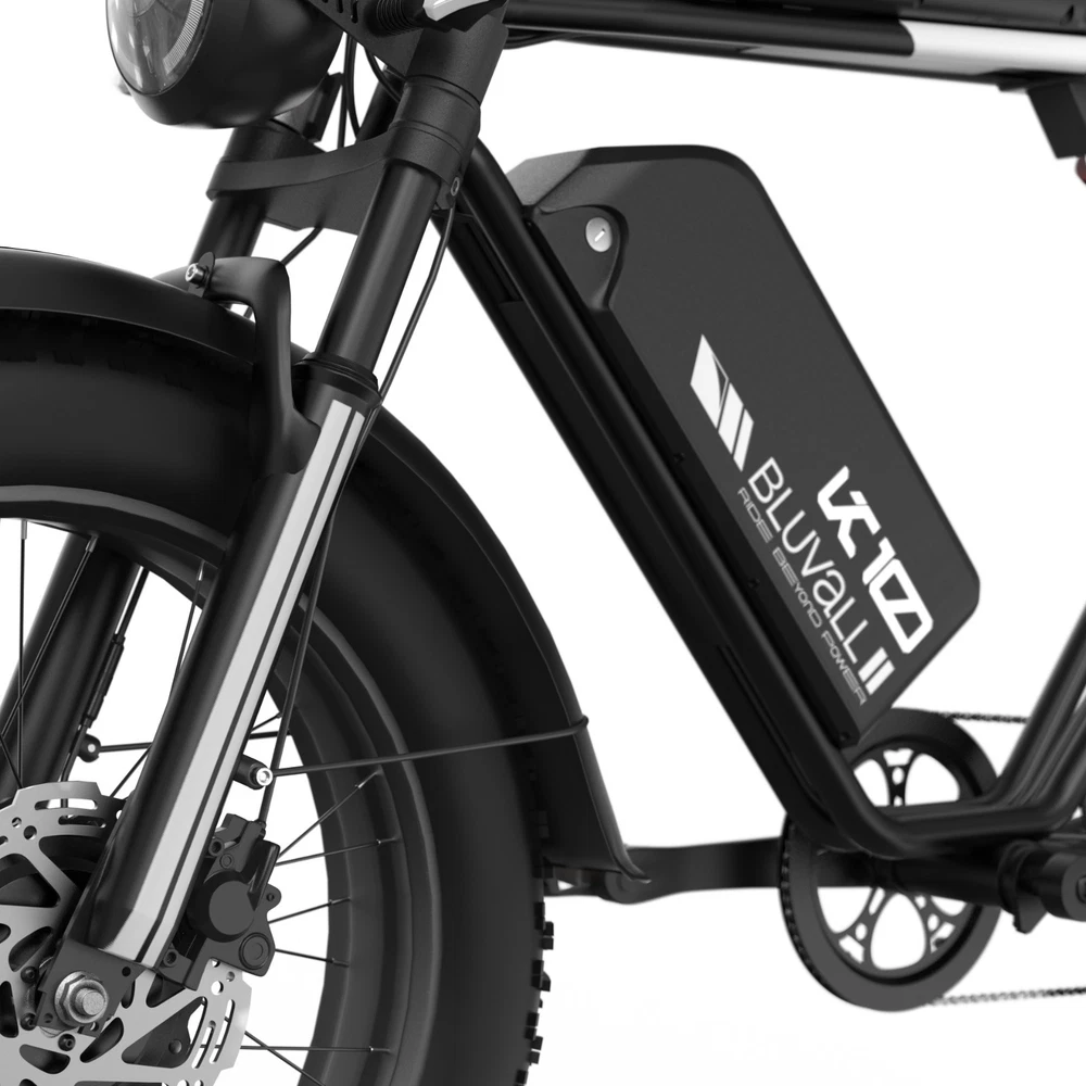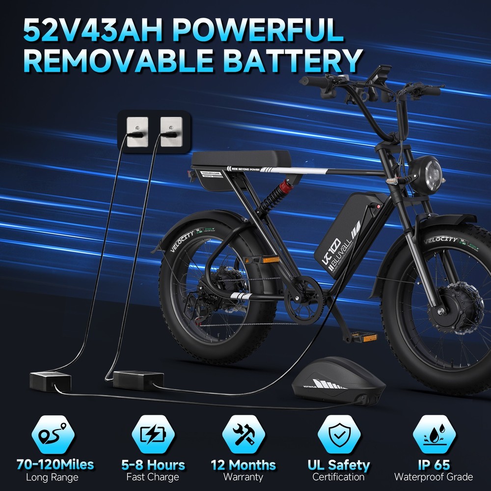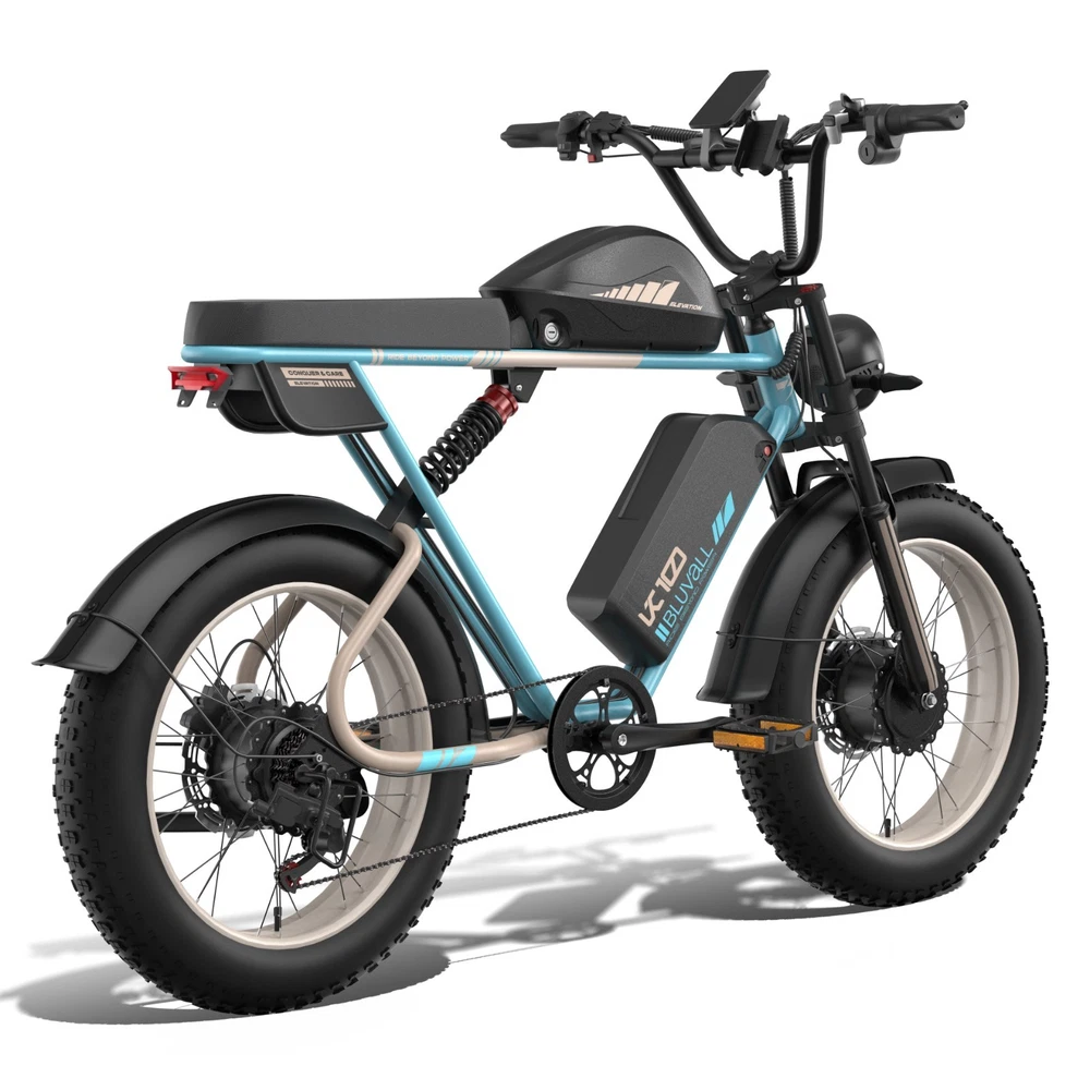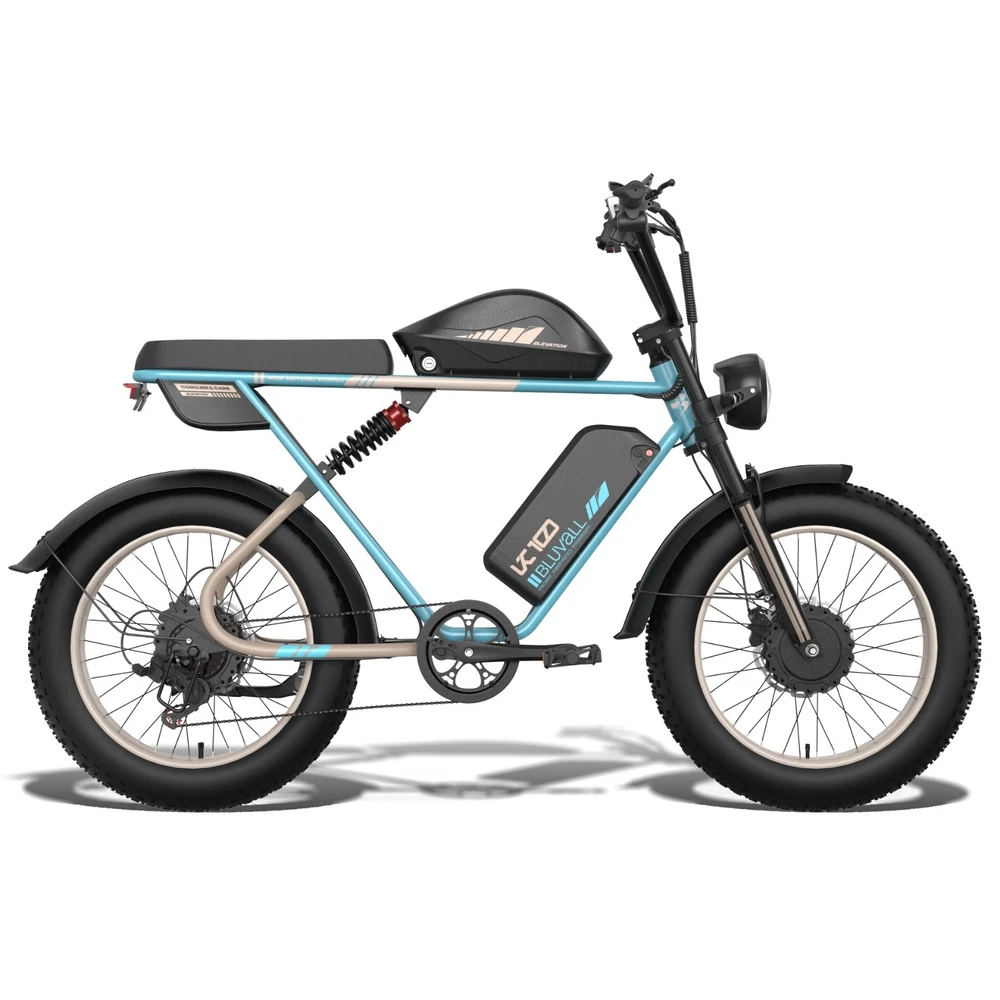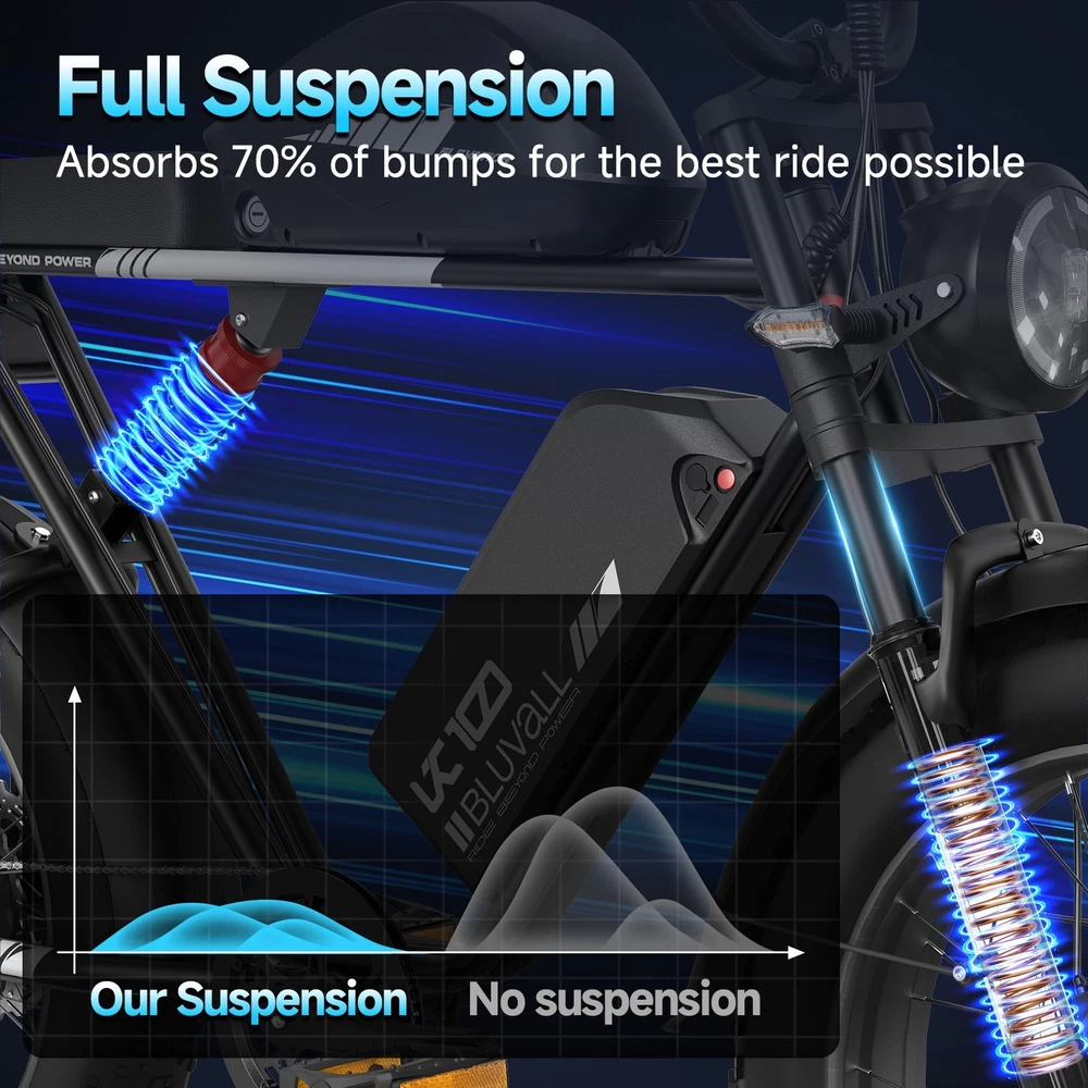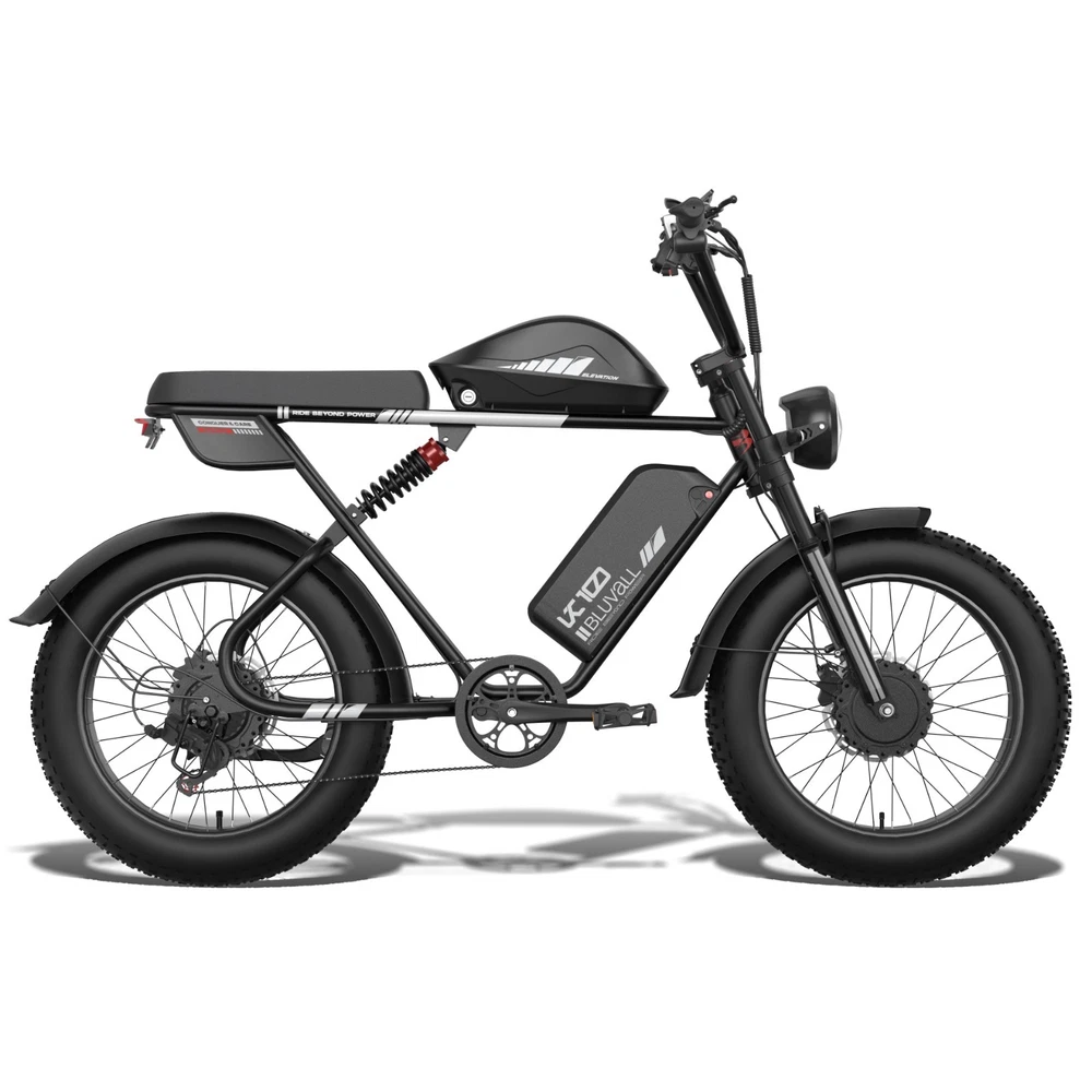 Why BLUVALL K10? The K10 e-bike is designed for convenience in both commuting and adventure, featuring a speed of 37 MPH and a long range of 120 miles,Barely any maintanence. E-SYSTEM Class Class 1/2/3 (Switchable) Motor Dual Geared Hub Brushless Motors, Rated 1000W x2 (Peak 1500W x2), Front & Rear Motor Torque 160Nm Controller 52V 25A x2 Battery Removable Dual BMS Lithium-ion Battery, Top 52V 20Ah + Bottom 52V 23Ah, 2236Wh Certification UL 2849 & UL 2271 Certified (Entire e-bike system and battery are certified) Charger 58.8V 3 Amp Charger, Aviation Connector, UL LISTED Charge Time Approx. 5~8 Hours Max Speed 37 MPH Max Range Up to 120 miles by pedal assist, 70+ miles by throttle (based on 70kg rider; varies with conditions) FEATURES Display Backlit LCD Multifunctional Display USB Port Display-Integrated USB Charging Port to charge your phone on the go Lights Integrated 500Lux Headlight & Front Turn Signal Lights & Rear Light with Turn Signals Riding Modes 3 Distinct Riding Modes, 5 Levels of Pedal Assist Pedal Assist 5 Levels, Cadence Sensor Speed Configuration Unlock the speed limit to 37MPH, or set the speed limit to a desired safe velocity. Water Resistance IPX6 Rating (Protects against powerful water jets from any direction) COMPONENTS Frame High-Strength Carbon Steel, Thickness 2.2~2.5mm Suspension Dual Suspension Front Fork Dual Crown Suspension Fork (120mm Travel) with lock-out and rebound adjustability for pro-level control and handling. Rear Shock Heavy-Duty Rear Shock (Hot 180mm, 30mm Travel) engineered to support heavy payloads and absorb major impacts for a stable, planted ride. Brake Front & Rear Hydraulic Disc Brakes Brake Rotor 180mm, 1.9mm thick Throttle Twist Throttle, Ergonomic Right-Hand Throttle Shifter Shimano, 7-Speed Freewheel SHIMANO 12~28T Rear Derailleur SHIMANO 7 Speed Cassette SHIMANO 12~32T, 7 speed Crank & Chainring 48T, 170mm Alloy Crank Bottom Bracket Hexagon Taper, PAS Sensor Handlebar Aluminum Ø31.8mm, Width 700mm Grips Durable Ergonomic Grip, Half Throttle Seatpost Forged Alloy, 30.9mm, 28cm 2-Bolt Clamp Stem Bar bore Ø31.8mm, Clamp I.D. Ø28.6mm, Height 60mm, Rise 0° Headset Sealed Bearing Headset Rim Material Aluminum Rim Size 20 x 3.0 Rim Type Wheel with Integral Hub Front Wheel Spokes 13G x 244/246mm, Black Stainless Rear Wheel Spokes 12G x 217/219mm, Black Stainless Hubs Disc Nutted Front / Rear Axles Tire Puncture Resistant Fat Tires, 20″ x 4.0″ Tubes Butyl Rubber,A/V Saddle Extended Two-Passenger Saddle, crafted from durable PU leather to comfortably share the ride Pedal 1 Pairs Alloy Platform Pedals Kickstand Side Kickstand, Aluminum alloy Fenders Full-Coverage Front & Rear Fenders Included Phone Holder Included DIMENSIONS & WEIGHT Net Weight 42 kg (92.6 lbs) Gross Weight 52 kg (114.6 lbs) Battery Weight 5.1kg x2(11.5lbs x2) Payload Capacity 150 kg (330 lbs) Recommended Rider Height 5'5"–6'7" (165cm ~200cm) Product Size 172 x 113 x 75 cm Packing Size 150 x 34 x 80 cm K10 Upgraded 37Mph Description 【 Powerful Dual Brushless Motors 】 Equipped with dual Rated 1000W Front & Rear brushless motors, delivering a combined peak power of 3000W and 160Nm of torque. Perfect for both city commutes and off-road adventures, it reaches speeds up to 37MPH , offering thrilling acceleration and smooth performance. Whether climbing hills or cruising, the dual motors ensure a powerful and stable ride. 【Removable 2236WH BMS Battery 】 Equipped with two 52V Top 20AH + Bottom 23AH batteries, which offering a range of 70-120 miles depending on the mode. Utilizing pedal assist, the range extends to an impressive 120 miles (single motor) and 70 miles (dual motors), with throttle mode, it covers up to 70 miles (single motor) and 40 miles (dual motors) .ensuring you travel without worries. (Calculation based on rider's weight of 70kg. Range varies according to road condition, weather, rider's weight etc.) The dual battery system ensures longer rides and added flexibility. Included are two chargers, allowing you to charge both batteries simultaneously or separately. You can charge directly on the bike or remove the batteries for charging, providing convenience at home or on the go. 【Dual Suspension & 20" Puncture-Proof Fat Tires 】 Equipped with dual-crown front suspension fork and rear shock, and the 20" fat tires, which provide great grip and excellent shock absorption, and effectively increase riding stability. Ensure that this fast electric bike performs well on various terrains. Whether you're navigating snow, sand, mud, or city streets, the all-terrain tires provide superior grip and stability. The full suspension system absorbs bumps and shocks, delivering a smooth and comfortable ride even on rough surfaces. 【Shimano 7 Speed Gears & Hydraulic Brakes System 】 Equipped with hydraulic disc brakes at the front and rear. These high-performance brakes provide precise stopping power in all conditions, including wet or muddy environments. Whether you're speeding downhill or navigating through the city, the hydraulic disc brakes ensure reliable, smooth braking. 【High-Strength Carbon Steel Frame】 Equipped with t he carbon steel frame, which provides excellent strength and durability, supporting up to 330 lbs (150 kg) of weight. Despite its robust construction, the frame is designed to be lightweight, making it easy to maneuver. Available in sleek color options, this bike combines durability with style. 【Multiple Riding Modes】 Offering pedal assist (5 levels), pure electric mode (5 levels), Cruiser mode, and manual cycling, the electric bike, cruiser mode for adults provides a tailored riding experience for every need. The added cruise control function ensures comfortable long-distance rides, while the intuitive digital display keeps track of important data such as speed, battery level, and pedal assist levels. 【Smart LCD Display & Upgraded Lights】 Equipped with an Color LCD display, you can easily monitor your speed, battery level, and ridi