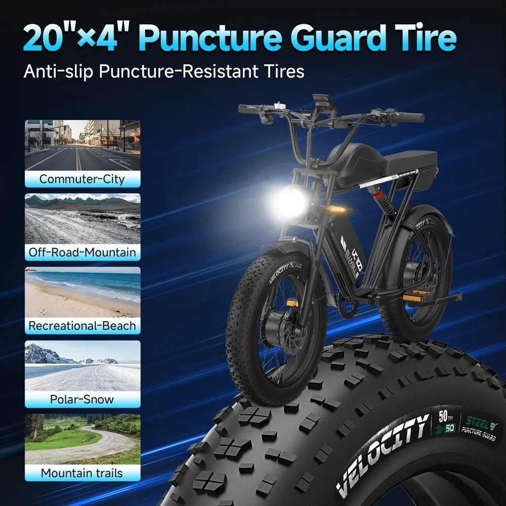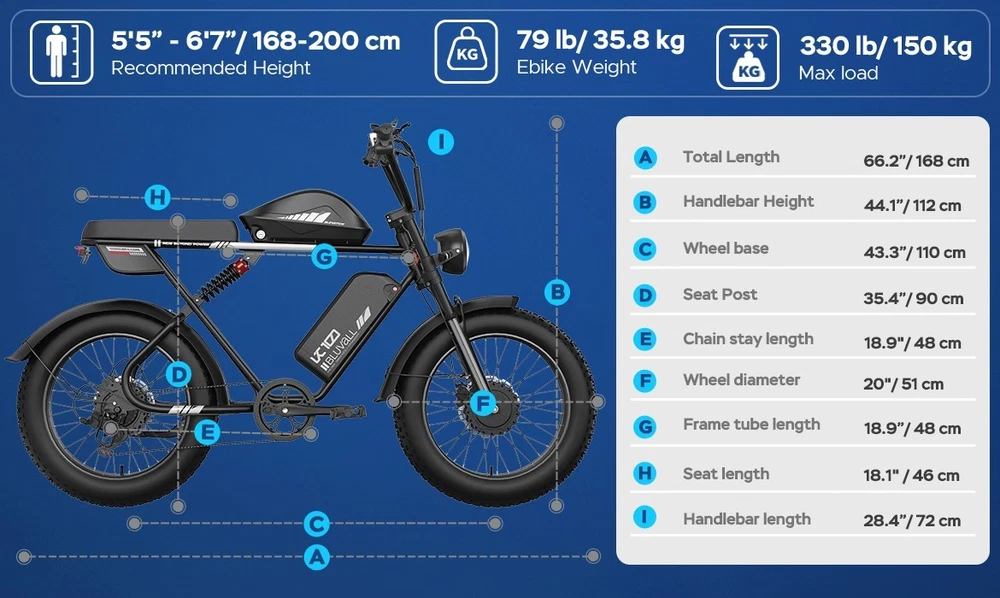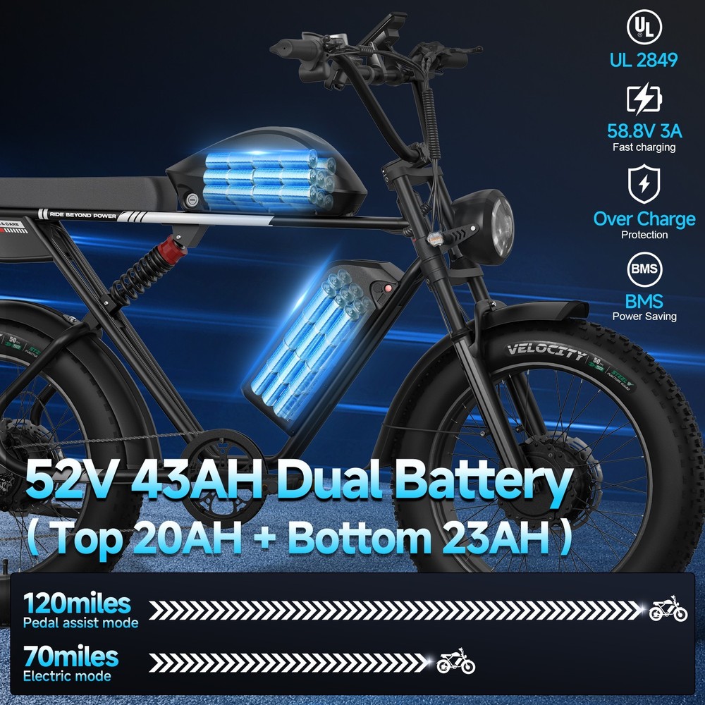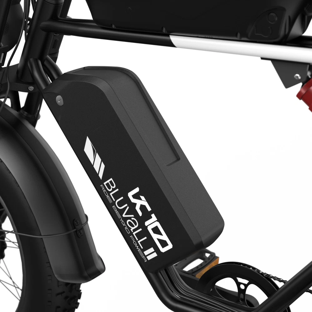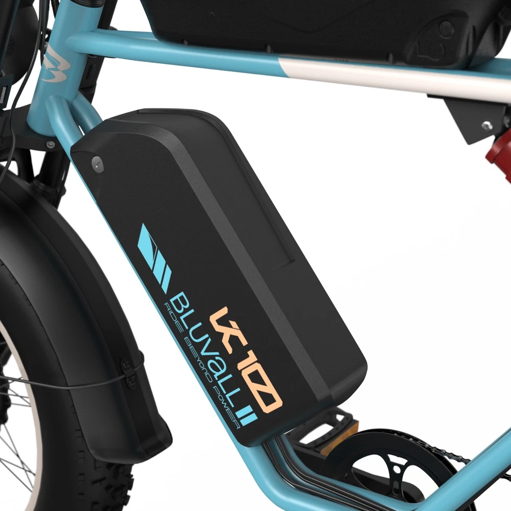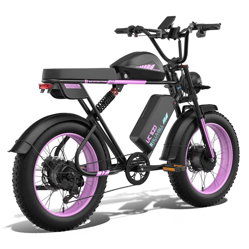 Why BLUVALL K10? The K10 e-bike is designed for convenience in both commuting and adventure, featuring a speed of 37 MPH and a long range of 120 miles,Barely any maintanence. E-SYSTEM Class Class 1/2/3 (Switchable) Motor Dual Geared Hub Brushless Motors, Rated 1000W x2 (Peak 1500W x2), Front & Rear Motor Torque 160Nm Controller 52V 25A x2 Battery Removable Dual BMS Lithium-ion Battery, Top 52V 20Ah + Bottom 52V 23Ah, 2236Wh Certification UL 2849 & UL 2271 Certified (Entire e-bike system and battery are certified) Charger 58.8V 3 Amp Charger, Aviation Connector, UL LISTED Charge Time Approx. 5~8 Hours Max Speed 37 MPH Max Range Up to 120 miles by pedal assist, 70+ miles by throttle (based on 70kg rider; varies with conditions) FEATURES Display Backlit LCD Multifunctional Display USB Port Display-Integrated USB Charging Port to charge your phone on the go Lights Integrated 500Lux Headlight & Front Turn Signal Lights & Rear Light with Turn Signals Riding Modes 3 Distinct Riding Modes, 5 Levels of Pedal Assist Pedal Assist 5 Levels, Cadence Sensor Speed Configuration Unlock the speed limit to 37MPH, or set the speed limit to a desired safe velocity. Water Resistance IPX6 Rating (Protects against powerful water jets from any direction) COMPONENTS Frame High-Strength Carbon Steel, Thickness 2.2~2.5mm Suspension Dual Suspension Front Fork Dual Crown Suspension Fork (120mm Travel) with lock-out and rebound adjustability for pro-level control and handling. Rear Shock Heavy-Duty Rear Shock (Hot 180mm, 30mm Travel) engineered to support heavy payloads and absorb major impacts for a stable, planted ride. Brake Front & Rear Hydraulic Disc Brakes Brake Rotor 180mm, 1.9mm thick Throttle Twist Throttle, Ergonomic Right-Hand Throttle Shifter Shimano, 7-Speed Freewheel SHIMANO 12~28T Rear Derailleur SHIMANO 7 Speed Cassette SHIMANO 12~32T, 7 speed Crank & Chainring 48T, 170mm Alloy Crank Bottom Bracket Hexagon Taper, PAS Sensor Handlebar Aluminum Ø31.8mm, Width 700mm Grips Durable Ergonomic Grip, Half Throttle Seatpost Forged Alloy, 30.9mm, 28cm 2-Bolt Clamp Stem Bar bore Ø31.8mm, Clamp I.D. Ø28.6mm, Height 60mm, Rise 0° Headset Sealed Bearing Headset Rim Material Aluminum Rim Size 20 x 3.0 Rim Type Wheel with Integral Hub Front Wheel Spokes 13G x 244/246mm, Black Stainless Rear Wheel Spokes 12G x 217/219mm, Black Stainless Hubs Disc Nutted Front / Rear Axles Tire Puncture Resistant Fat Tires, 20″ x 4.0″ Tubes Butyl Rubber,A/V Saddle Extended Two-Passenger Saddle, crafted from durable PU leather to comfortably share the ride Pedal 1 Pairs Alloy Platform Pedals Kickstand Side Kickstand, Aluminum alloy Fenders Full-Coverage Front & Rear Fenders Included Phone Holder Included DIMENSIONS & WEIGHT Net Weight 42 kg (92.6 lbs) Gross Weight 52 kg (114.6 lbs) Battery Weight 5.1kg x2(11.5lbs x2) Payload Capacity 150 kg (330 lbs) Recommended Rider Height 5'5"–6'7" (165cm ~200cm) Product Size 172 x 113 x 75 cm Packing Size 150 x 34 x 80 cm K10 Upgraded 37Mph Description 【 Powerful Dual Brushless Motors 】 Equipped with dual Rated 1000W Front & Rear brushless motors, delivering a combined peak power of 3000W and 160Nm of torque. Perfect for both city commutes and off-road adventures, it reaches speeds up to 37MPH , offering thrilling acceleration and smooth performance. Whether climbing hills or cruising, the dual motors ensure a powerful and stable ride. 【Removable 2236WH BMS Battery 】 Equipped with two 52V Top 20AH + Bottom 23AH batteries, which offering a range of 70-120 miles depending on the mode. Utilizing pedal assist, the range extends to an impressive 120 miles (single motor) and 70 miles (dual motors), with throttle mode, it covers up to 70 miles (single motor) and 40 miles (dual motors) .ensuring you travel without worries. (Calculation based on rider's weight of 70kg. Range varies according to road condition, weather, rider's weight etc.) The dual battery system ensures longer rides and added flexibility. Included are two chargers, allowing you to charge both batteries simultaneously or separately. You can charge directly on the bike or remove the batteries for charging, providing convenience at home or on the go. 【Dual Suspension & 20" Puncture-Proof Fat Tires 】 Equipped with dual-crown front suspension fork and rear shock, and the 20" fat tires, which provide great grip and excellent shock absorption, and effectively increase riding stability. Ensure that this fast electric bike performs well on various terrains. Whether you're navigating snow, sand, mud, or city streets, the all-terrain tires provide superior grip and stability. The full suspension system absorbs bumps and shocks, delivering a smooth and comfortable ride even on rough surfaces. 【Shimano 7 Speed Gears & Hydraulic Brakes System 】 Equipped with hydraulic disc brakes at the front and rear. These high-performance brakes provide precise stopping power in all conditions, including wet or muddy environments. Whether you're speeding downhill or navigating through the city, the hydraulic disc brakes ensure reliable, smooth braking. 【High-Strength Carbon Steel Frame】 Equipped with t he carbon steel frame, which provides excellent strength and durability, supporting up to 330 lbs (150 kg) of weight. Despite its robust construction, the frame is designed to be lightweight, making it easy to maneuver. Available in sleek color options, this bike combines durability with style. 【Multiple Riding Modes】 Offering pedal assist (5 levels), pure electric mode (5 levels), Cruiser mode, and manual cycling, the electric bike, cruiser mode for adults provides a tailored riding experience for every need. The added cruise control function ensures comfortable long-distance rides, while the intuitive digital display keeps track of important data such as speed, battery level, and pedal assist levels. 【Smart LCD Display & Upgraded Lights】 Equipped with an Color LCD display, you can easily monitor your speed, battery level, and ridi