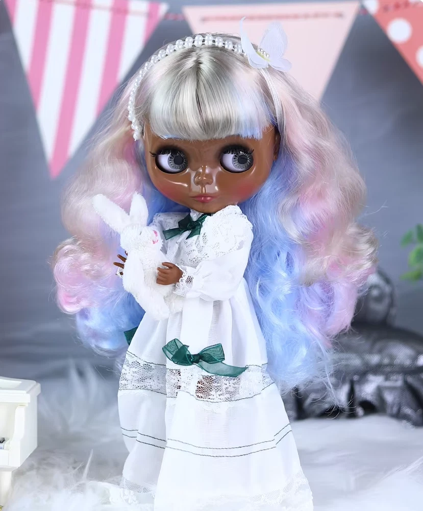 Blythe Doll with White Dress Shoes Super Black Skin 4 Colors Eyes BJD Toy Puppet There are just Limited quantity available ! Get yours NOW before we run out!!! Step into a world of creativity and magic with our stunning 12-inch Blythe doll! Perfect for collectors and doll enthusiasts, this Blythe doll is ready to captivate hearts with her unique charm and endless possibilities for customization. Features: ✨ Expressive Eyes: Four different eye colors and positions with a simple pull of a string, reflecting her many moods and styles. 🎀 Chic Wardrobe: Dressed in a stylish outfit, she’s ready to mix and match with your favorite fashion pieces. 👗 Customizable Beauty: Change her hair, makeup, and style to create a doll that’s uniquely yours. 🌈 Premium Quality: Crafted from durable, high-quality materials to ensure she stands the test of time. 📏 Perfect Size: At 12 inches tall, she's the ideal size for both play and display. Why You'll Love Our 12" Blythe Doll: Endless Creativity: Perfect for photography, crafting, and artistic projects, she’s a blank canvas for your imagination. Community Connection: Join a worldwide network of Blythe enthusiasts who share your passion and creativity. Unique Gift Idea: A thoughtful and personalized gift for birthdays, holidays, or any special occasion, sure to delight both children and adults. Bring home the magic of the 12" Blythe doll today and dive into a world where imagination knows no bounds. Embrace the charm, creativity, and joy that only a Blythe doll can offer. Order now and let the adventures begin! Set - 12" Blythe joint body doll with Beauty hair + White Dress + Shoes and Hair accessory.