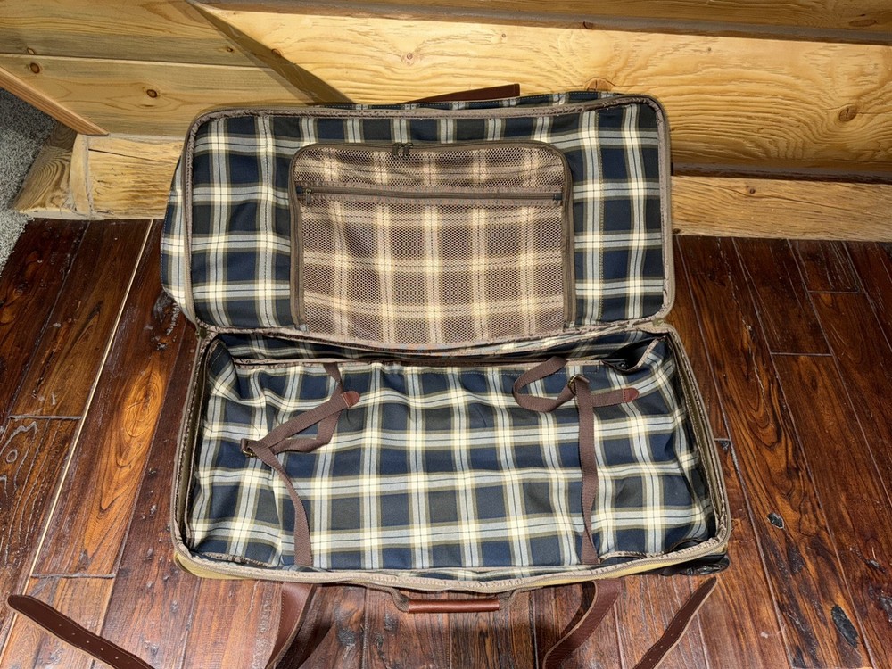 New Never Used!! The Bob Timberlake Large Tan Canvas Leather Wheeled Duffle Luggage is a stylish and durable travel bag designed for the modern individual. Made of high-quality leather with a solid brown color, this large duffle bag features convenient wheels for easy rolling transport. The unisex adult design makes it suitable for anyone looking for a reliable and fashionable luggage option. Perfect for weekend getaways or business trips, this duffle bag combines functionality with a touch of luxury.