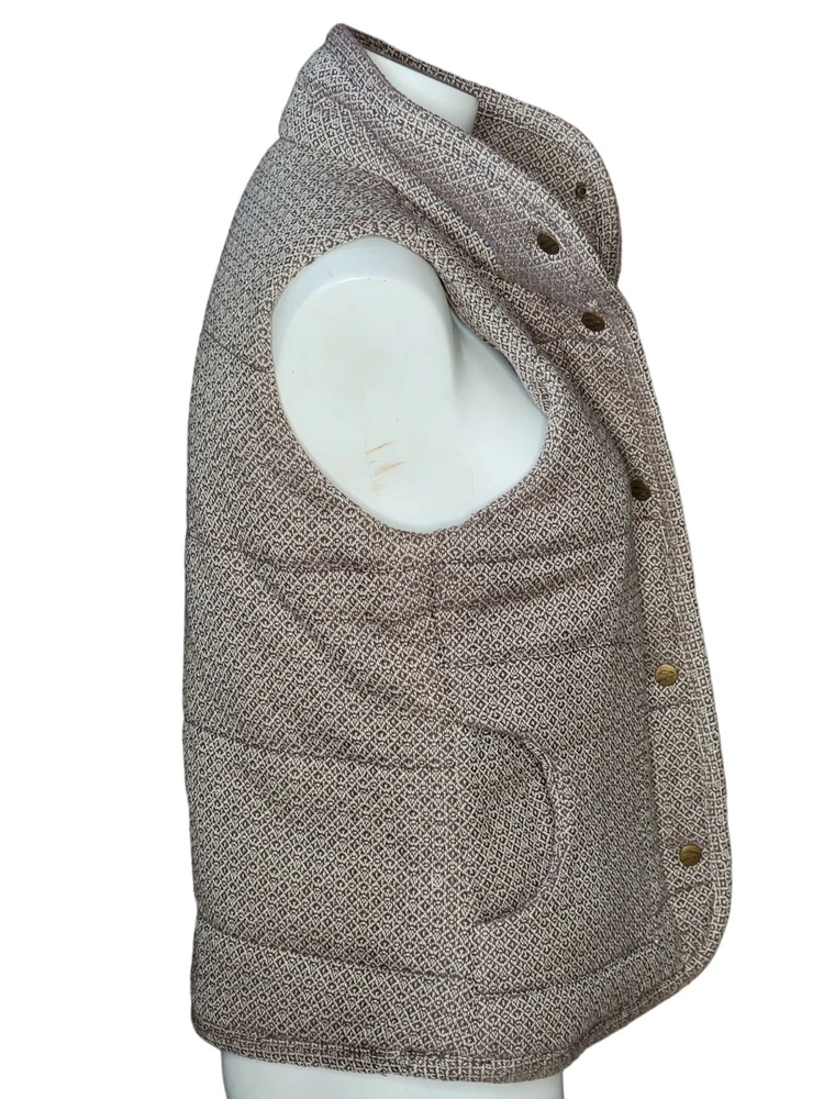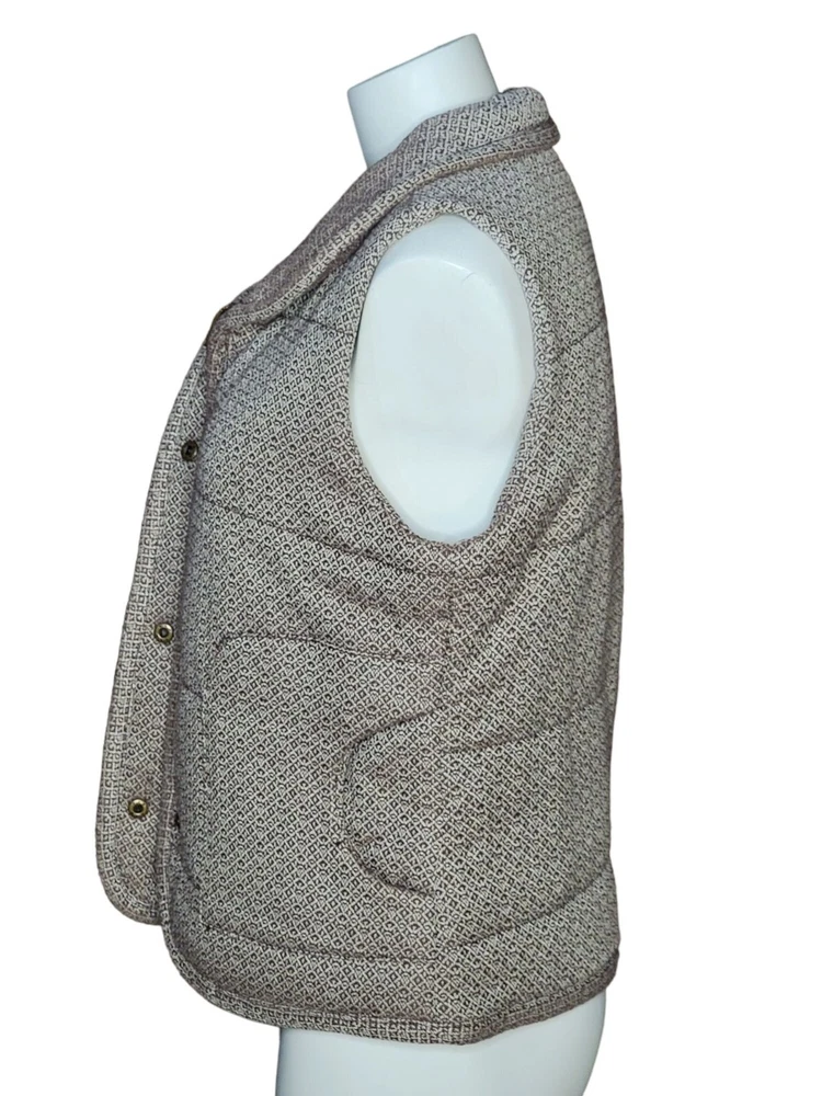 The Bob Timberlake Women's Quilted Vest is the perfect companion for your outdoor adventures. With a snap and zipper-front closure, you can be sure of an easy and secure fit. It's stylish geometric patterns come in handy on breezy days as quilted insulation ensures warmth and comfort. Features: • Sleevless • Hip Pockets • Lined • Shell 60% Cotton 40% Polyester • Quilted, Pockets • Lining 100% Polyester • Padding 100% Polyester Size: Womens Medium Flat Lay Measurements Pit to pit 20 in / 51 cm Length 22 in / 56 cm Condition: Pre-Owned Good Good condition Gently used No rips, stains, tares, or pilling No visible signs of wear Measurements are found in the description Please review all photos and descriptions closely before purchasing. Thank you! Smoke free workspace Please read the description for further details and measurements, Thank you!