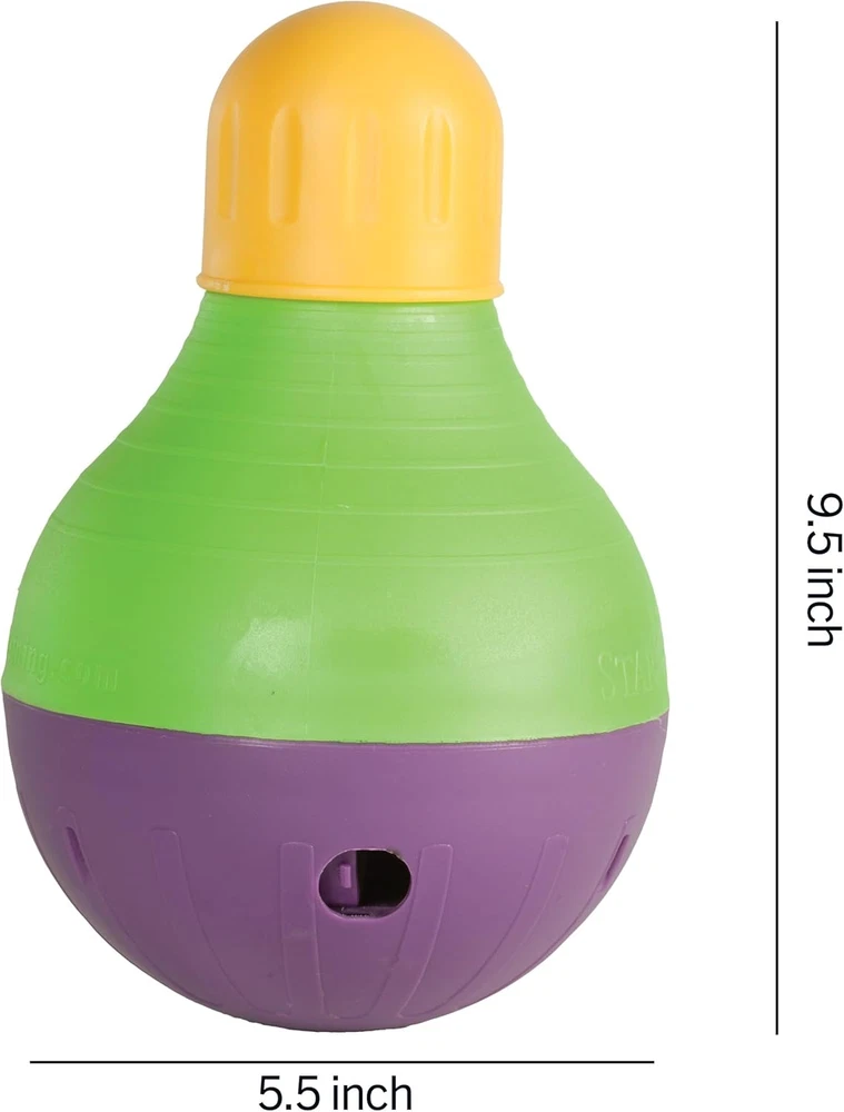 Exercises and feeds your dog at the same time. The Large bottom Chamber fits up to 3 cups of Food - enough for a full meal Adjustable openings at the top and bottom accommodate most types of dog Food and allow you to regulate the difficulty level Weighted anti-slip bottom makes the toy wobble erratically enticing your dog to play Every dog plays differently and, since not all toys are created equal, it’s always best to keep a close watch on your pup in case things get ruff. Supervised play will help toys last longer and most importantly keep your pal safe. No dog toy is truly indestructible, so always remove the toy from playtime if pieces begin to break off. Interactive toy holds up to three cups of food and has adjustable openings.