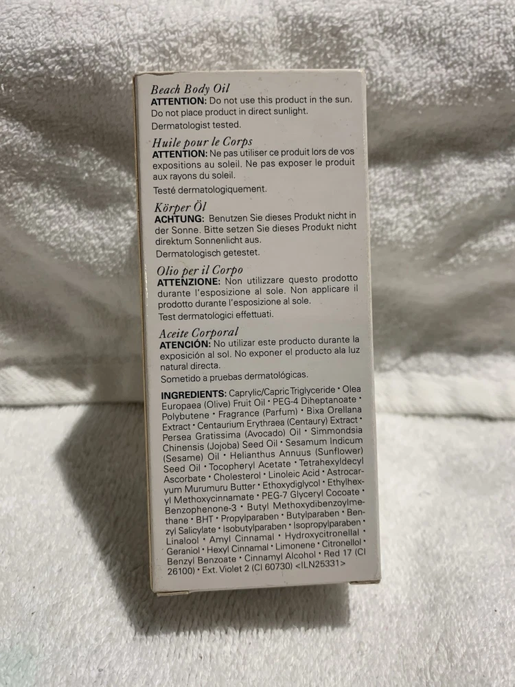 This body oil is amazing—lightweight, hydrating, and leaves skin glowing with a subtle, beachy scent. Perfect for a radiant summer vibe! Packaging is pristine, and shipping was super fast. Seller is professional and responsive—highly recommend grabbing this discontinued gem while you can!