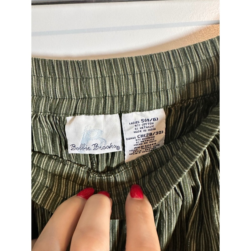 Evokes images of earthy elegance with this vintage Bobbie Brooks skirt. An intriguing metallic thread is woven into a soothing olive green, creating subtle shimmers that catch the light with every move. The relaxed, maxi silhouette and forgiving elastic waistband ensure effortless comfort, allowing you to embrace graceful movement. Its unique hi-low hem adds a touch of modern flair, breaking away from traditional designs to make a distinct impression. Perfect for relaxed brunch dates, garden parties, or weekend strolls, this skirt adds a touch of charm to any occasion. Type: Skirt Style: Maxi Skirt Length: Long Color: Green Department: Women Pattern: Striped Material: Cotton Blend, Cotton, Metallic Fabric Type: Knit Features: Elastic Waist, Lightweight, Asymmetric Character: Bohemian, Retro, Earthy Closure: Pull On Occasion: Casual, Party/Cocktail, Travel Keywords: Bobbie Brooks, maxi skirt, olive green skirt, metallic skirt, vintage skirt, small skirt, elastic waist skirt, striped skirt, boho skirt, retro skirt, hi low skirt, women's skirt, S skirt