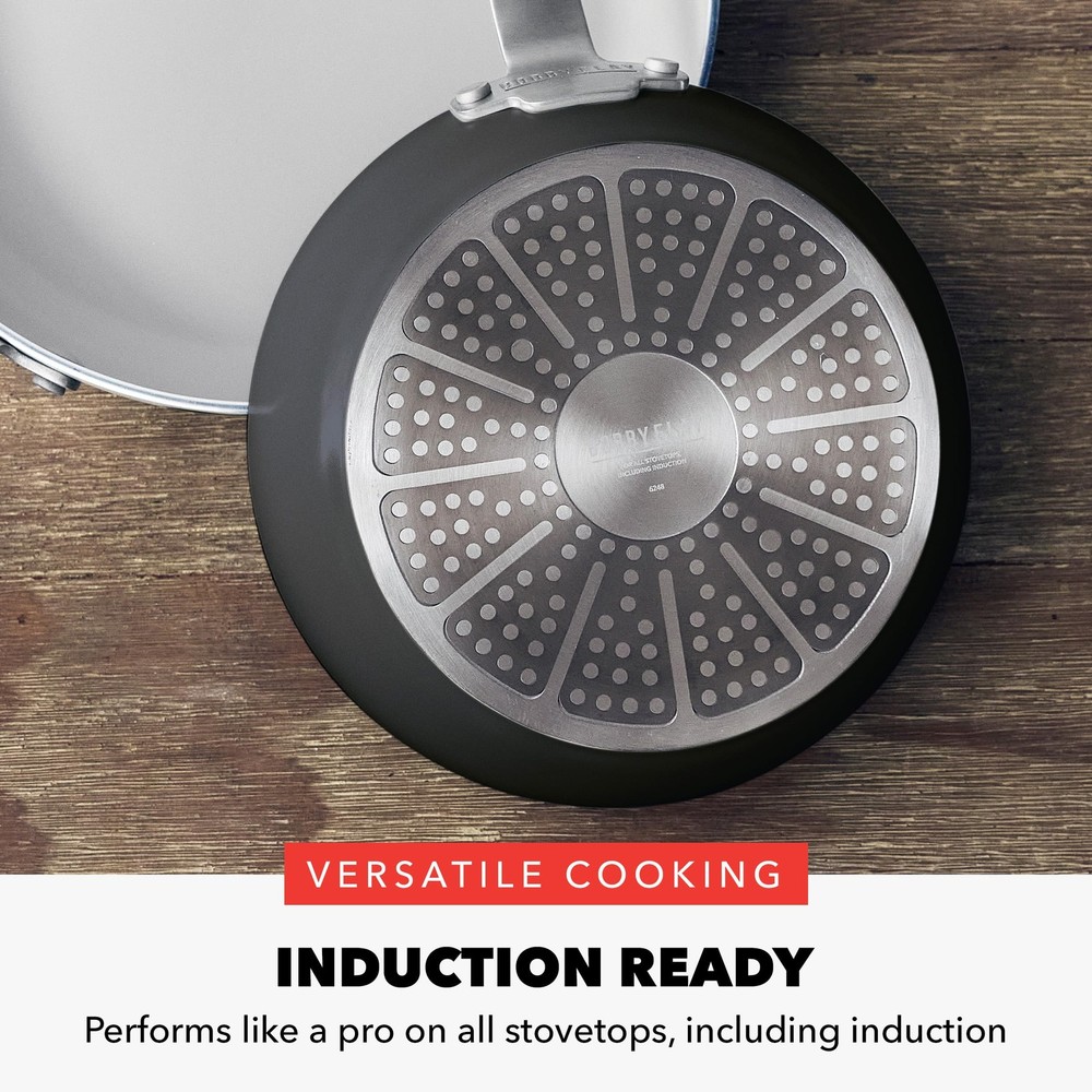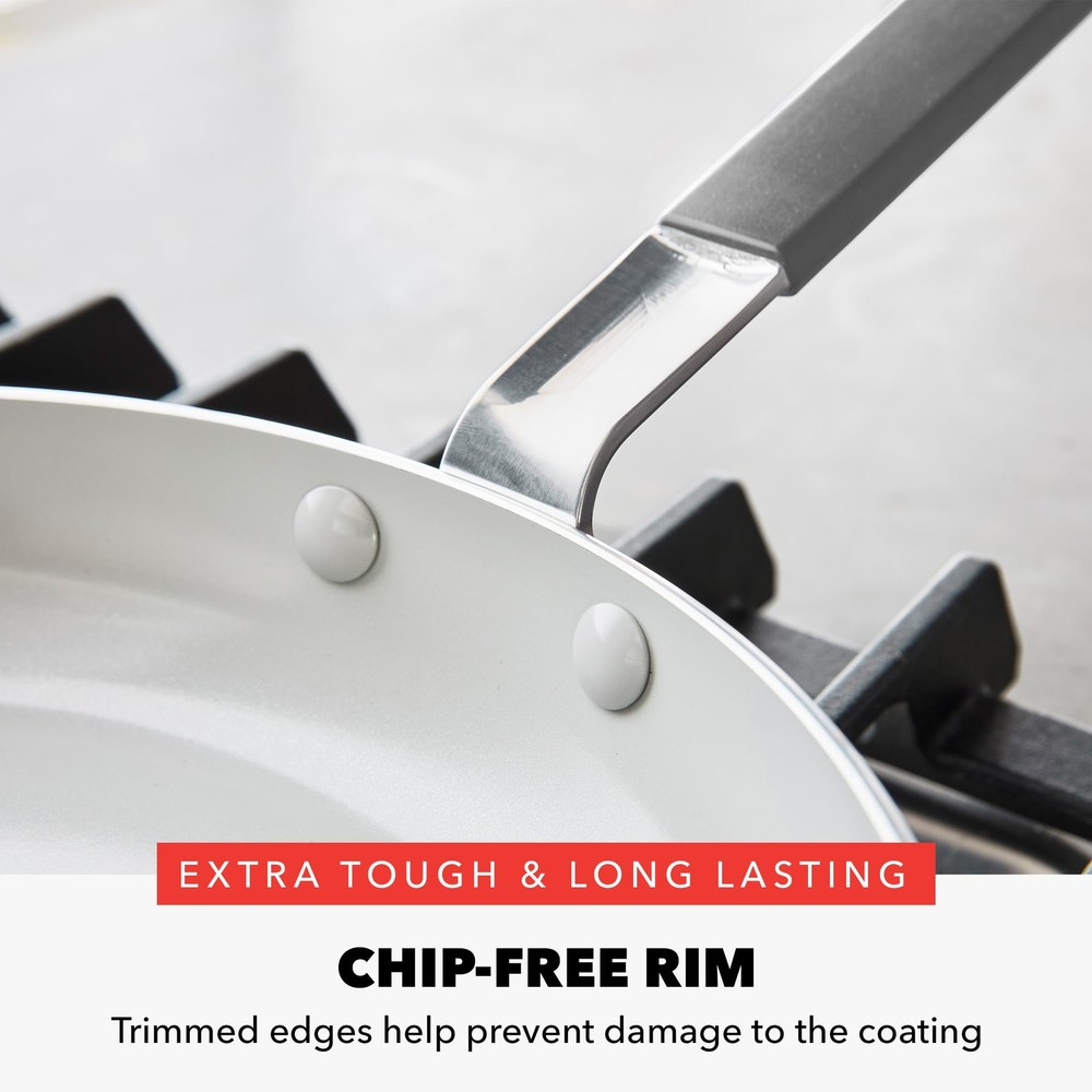 BOBBY FLAY x : Legendary chef Bobby Flay partnered with to create innovative cookware that brings pro cooking to any home REINFORCED WITH DIAMONDS: This collection features ’s diamond-infused ceramic nonstick for incredible release, remarkable durability, and professional performance TOXIN-FREE: 's signature healthy ceramic nonstick coating is free of PFAS, PFOA, lead, and cadmium STAY-COOL CHEF HANDLE: Inspired by restaurant kitchens, this pan has a long chef handle with a stay-cool silicone grip that gives you total control and amazing comfort QUICK-HEATING BODY: Quick-heating body lets you better control your heat so you can dial in the right temp for your meal CHIP-FREE RIM: An ingenious, thoughtfully designed chip-free rim add extra strength and durability INDUCTION READY: Bring pro cooking where you need it: suitable for all stovetops including gas, electric, even induction, and oven safe up to 392˚F EASY TO CLEAN: Dishwasher safe and easy to clean for simple cleanup