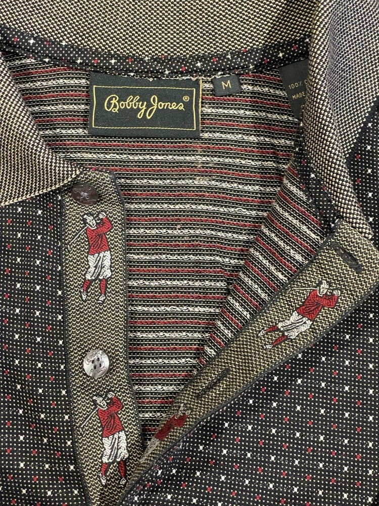 Size Type: Regular Pattern: Golf Player Handmade: No Fit: Regular Country/Region of Manufacture: Thailand Size: M Closure: Button Garment Care: Machine Washable Features: Breathable Type: Polo Theme: Sports Color: Brown Signed: No Personalize: No Brand: Bobby Jones Accents: Button Sleeve Length: Short Sleeve Occasion: Activewear, Casual Neckline: Collared Performance/Activity: Golf Season: Fall, Spring, Summer Department: Men Material: Cotton