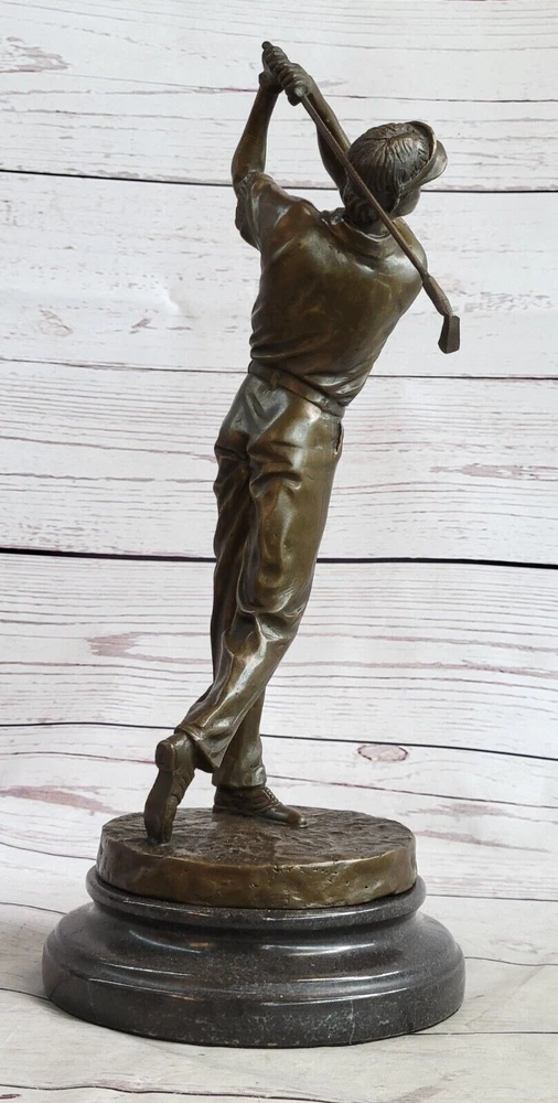 Bobby Jones Golfer Golf Club Collector Sports Memorabilia Bronze Marble Decor Bobby Jones Golfer Golf Club Collector Sports Memorabilia Bronze Marble Decor Condition : This sculpture is in perfect condition Bronze Dimensions with Marble Base: Height 13" X Width 6" Marble Dimensions: Diameter 6" Height without base:12" Weight:9 LBS Inventory:26YRD3954062 Immerse yourself in the world of golf with this captivating bronze sculpture. Depicting a skilled golfer in action, the sculpture captures the intensity and focus of the player as he watches his ball soar through the air. With his head tilted upwards, his eyes track the trajectory of the ball, calculating his next move. His body is poised with precision, reflecting his expertise and dedication to the game. Every detail of the golfer's form and attire is meticulously crafted, from the ripples in his clothes to the texture of the manicured grass beneath his feet. The sculpture is a testament to the artist's skill and attention to detail. Made from 100% bronze, it showcases the beauty and timeless allure of this noble sport. Created using the revered "Lost Wax Method," the sculpture bears the signature of the renowned artist Milo, guaranteeing its authenticity and artistic value. Mounted on a marble base, this sculpture exudes elegance and stability. Whether displayed in a golf enthusiast's collection, a sports-themed room, or as a centerpiece in a golf club, this bronze sculpture captures the spirit and passion of the game. It invites admiration and serves as a reminder of the precision and strategy that golf demands, making it a cherished addition to any space. Golfer Golf Bronze Marble Statue Club Trophy Tournament PGA Art Birthday Gift www.bronzhaus.com Video will open in a new window Using the eBay App? Paste link into a browser window: [isdntekvideo] Shipping Terms : Most of our items are shipped via USPS (United States Postal Service) mail or UPS. Most orders are shipped within 24-48 hours of purchase. Please be aware that not all items are available for USPS shipping due to size and weight. We do ship to Hawaii, Alaska, Canada, Puerto Rico, APO/AE, and U.S. Virgin Islands, however, an additional charge may be required. Please contact us before making any purchases in these areas. For Non-USA customers, you may be responsible for all duty, tax, brokerage fees that may be due upon delivery (shipping costs cover freight charges only). We also ship internationally. Please refer to the "Shipping and Handling" chart for the rates for each area. Payment : We accept just about any form of payment. PayPal, Master Card, Visa or American Express credit cards. Money orders, cashiers checks, and even personal or business checks. For governmental institutions, we will also accept a purchase order. Please understand that for personal or business checks we have to wait for the check to clear (usually 7 days) before shipping. Condition : New Detailed Hand Crafted Hot Cast Bronze Satisfaction Guaranteed. This is Stock Photo, Slight Color Variation!! Listing and template services provided by inkFrog
