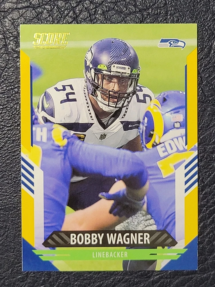 Capture a piece of football history with this set of two trading cards featuring the talented Bobby Wagner. From the 2023 Panini Prizm set, the Orange Disco card sparkles with an eye-catching design, while the 2021 Panini Score Gold card boasts a classic look. Both cards celebrate Wagner's impressive career with the Seattle Seahawks, Los Angeles Rams, and Washington Commanders, as well as his time with the Utah State Aggies in college. Each card is crafted in the United States and showcases standard-size, high-quality card stock. These non-autographed inserts and parallels are must-haves for fans and collectors alike. The cards include English language details and commemorate the exciting Super Bowl event. Add a touch of NFL prestige to your collection with these striking representations of Bobby Wagner's athletic prowess.