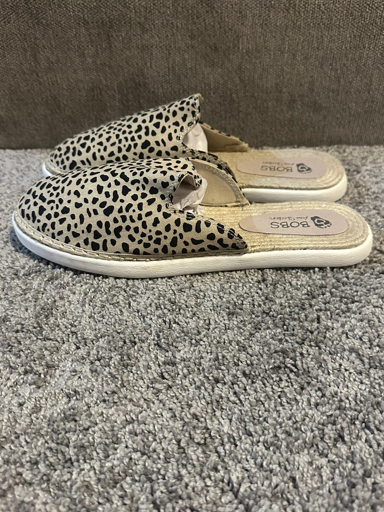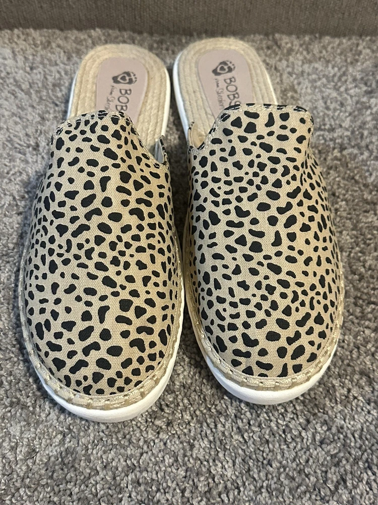 Elevate your casual style with these Bobs by Skechers slip-on mules. The leopard print fabric upper is accented with a multicolor pattern, adding a playful touch to your wardrobe. The flat heel and rubber outsole provide comfort and durability, making them perfect for everyday wear. These mules are designed with a slip-on closure for easy wear and are available in UK shoe size 6, US shoe size 9, and EU shoe size 39. The fabric lining and insole provide additional comfort, while the brand's reputation for quality ensures longevity. Perfect for women who want to add a touch of style to their comfort shoes collection.
