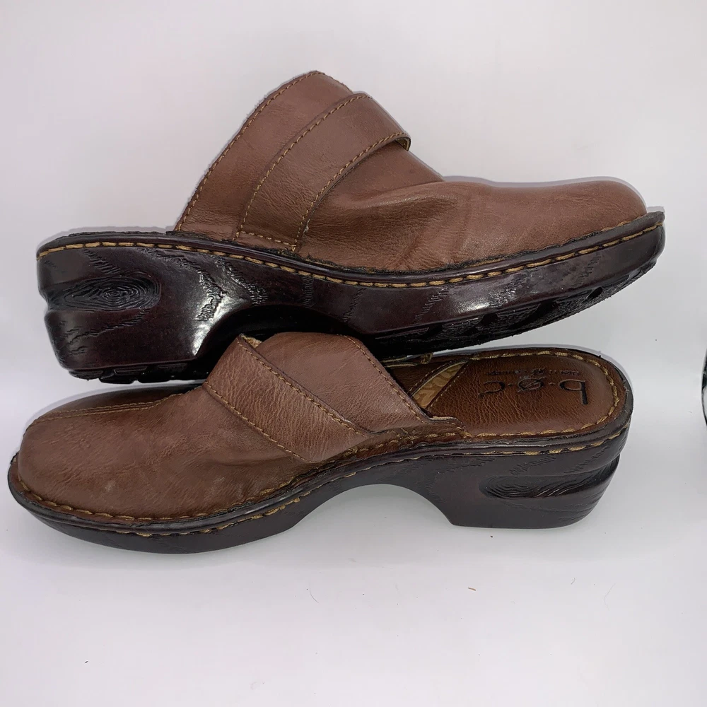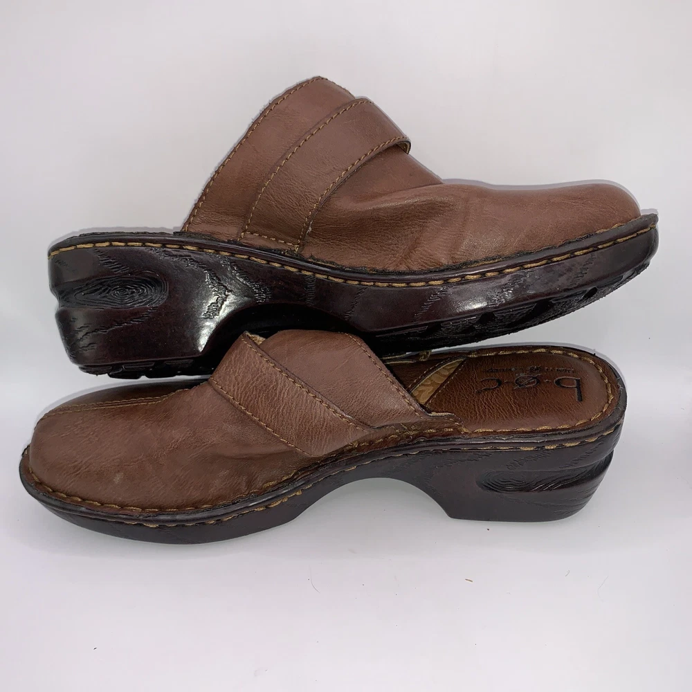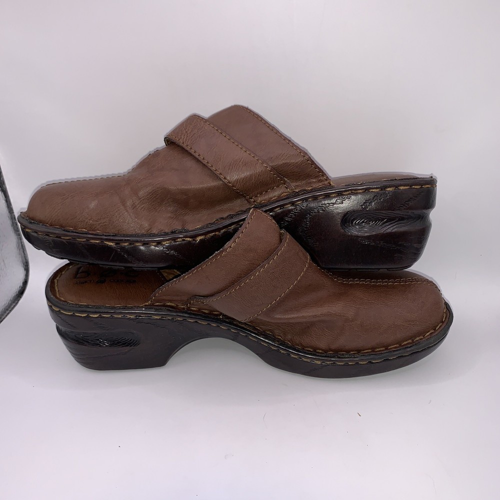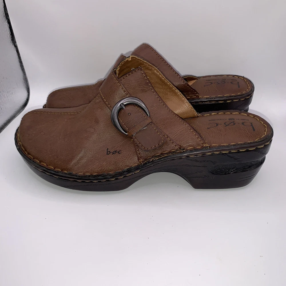 These are Boc Born women's brown leather slip-on shoes in size 8. They feature a round toe, a wedge heel, a strap with a buckle accent, and the Børn logo. The shoes provide arch support and cushioning for comfort and are designed with a nature-inspired, classic theme. Ideal for casual occasions, these slip-on shoes are both stylish and practical.CONDITION CAN BE SEEN IN PHOTOS. PLEASE LOOK AT ALL PHOTOS AS THERE IS A TEAR IN THE TOP OF ONE SHOE AS SEN IN PHOTOS