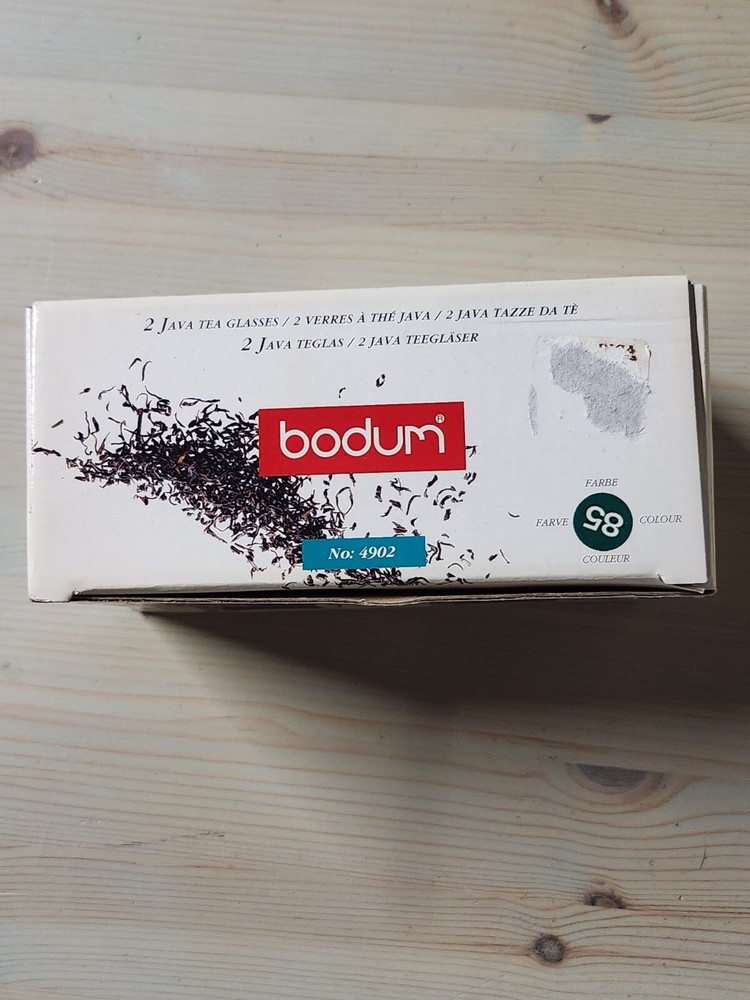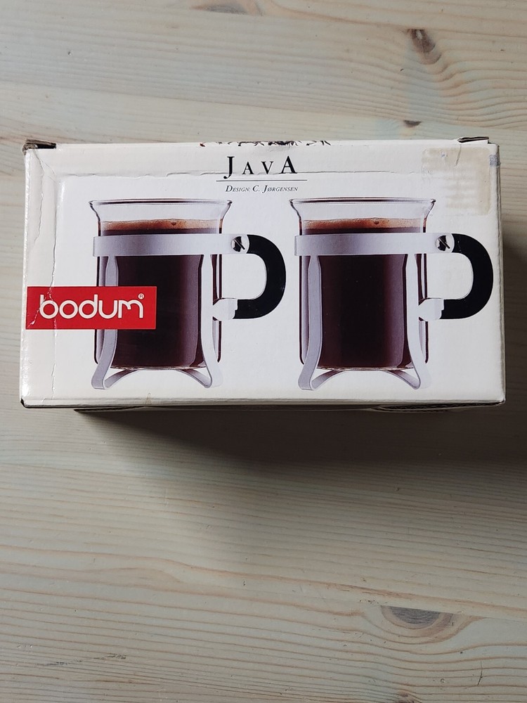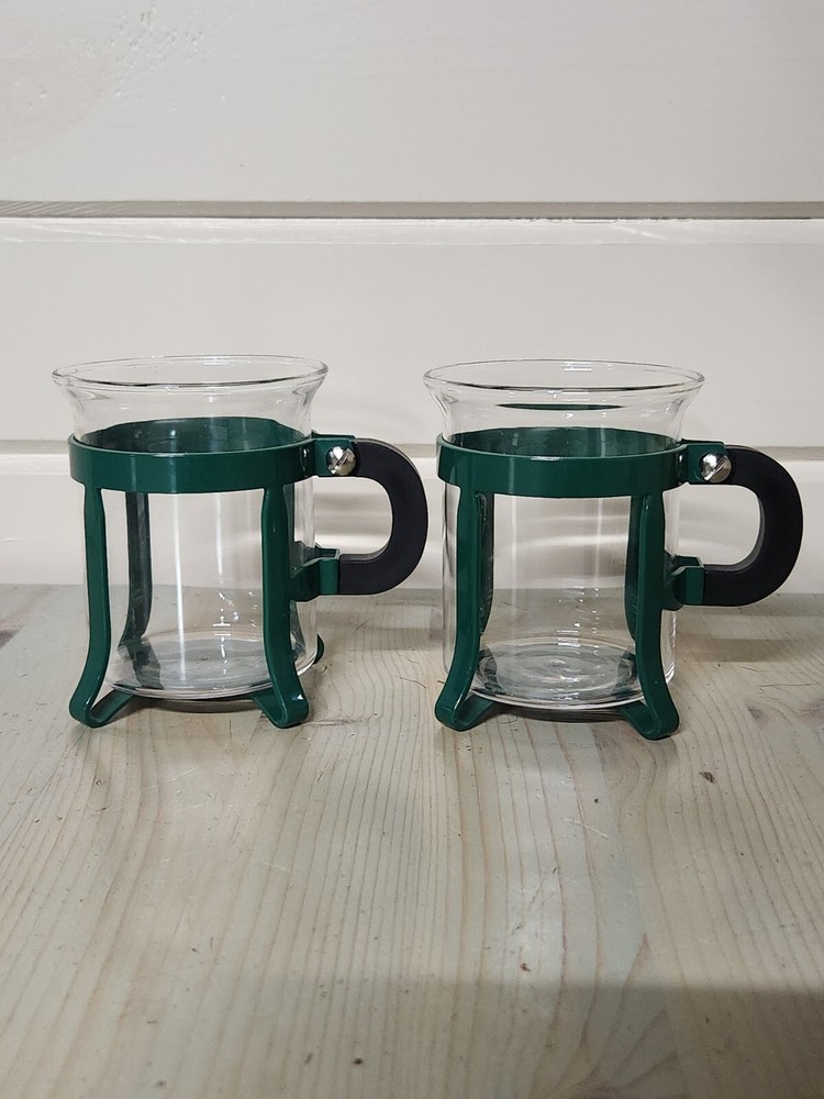 These are Bodum Java tea glasses, a vintage design by C. Jorgensen. Here's what you might want to know: Capacity: Each glass holds approximately 7 ounces of liquid. Design: The mug is enclosed in green plastic with a black handle and silver screw. Origin: These glasses were madeSwitzerland. Fast shipping (excluding holidays) All items sold as is and as described. Please see all photos as these are part of the description and read full description for any disclosed flaws or defects.