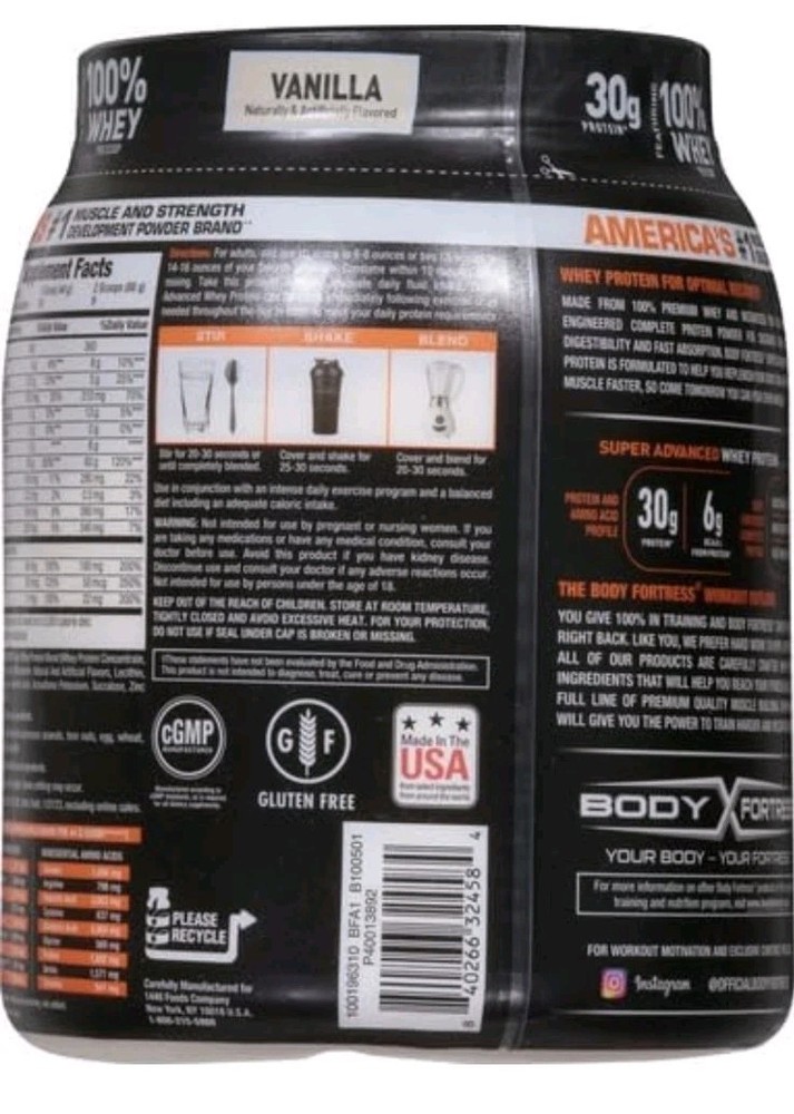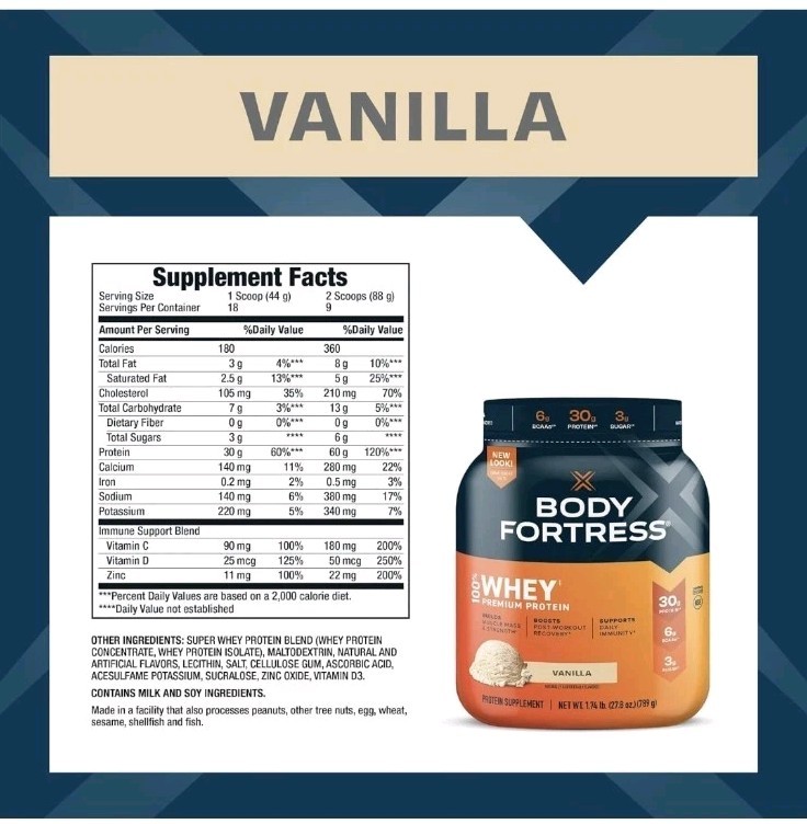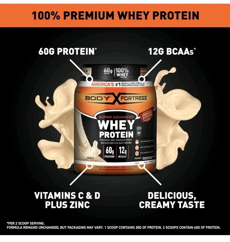 Body Fortress Super Adv Whey Protein Pwdr Gluten Free Vanilla 1.74lb Exp 03/27 IMMUNE SUPPORT FORMULA – Boost your daily wellness with added Vitamins C & D and Zinc, key nutrients that help support a healthy immune system, while meeting your fitness goals. SUPERIOR PROTEIN BLEND – Each serving of Body Fortress Whey Protein delivers 30g of protein to fuel lean muscle growth, recovery, and strength – perfect for post-workout support or any time of day. DELICIOUS VANILLA FLAVOR – Enjoy smooth, rich vanilla taste in every scoop! Mixes effortlessly with water, milk, or your favorite shake recipe for a creamy, satisfying protein drink. CLEAN NUTRITION FOR FITNESS ENTHUSIASTS – Packed with essential amino acids and free from aspartame, this whey protein powder is low in sugar, gluten-free, and ideal for supporting a clean diet. CONVENIENT SIZE FOR DAILY USE – The 1.74 lb tub provides plenty of servings for daily recovery, weight training, or on-the-go nutrition. Fuel your workouts with a trusted high-quality protein source.