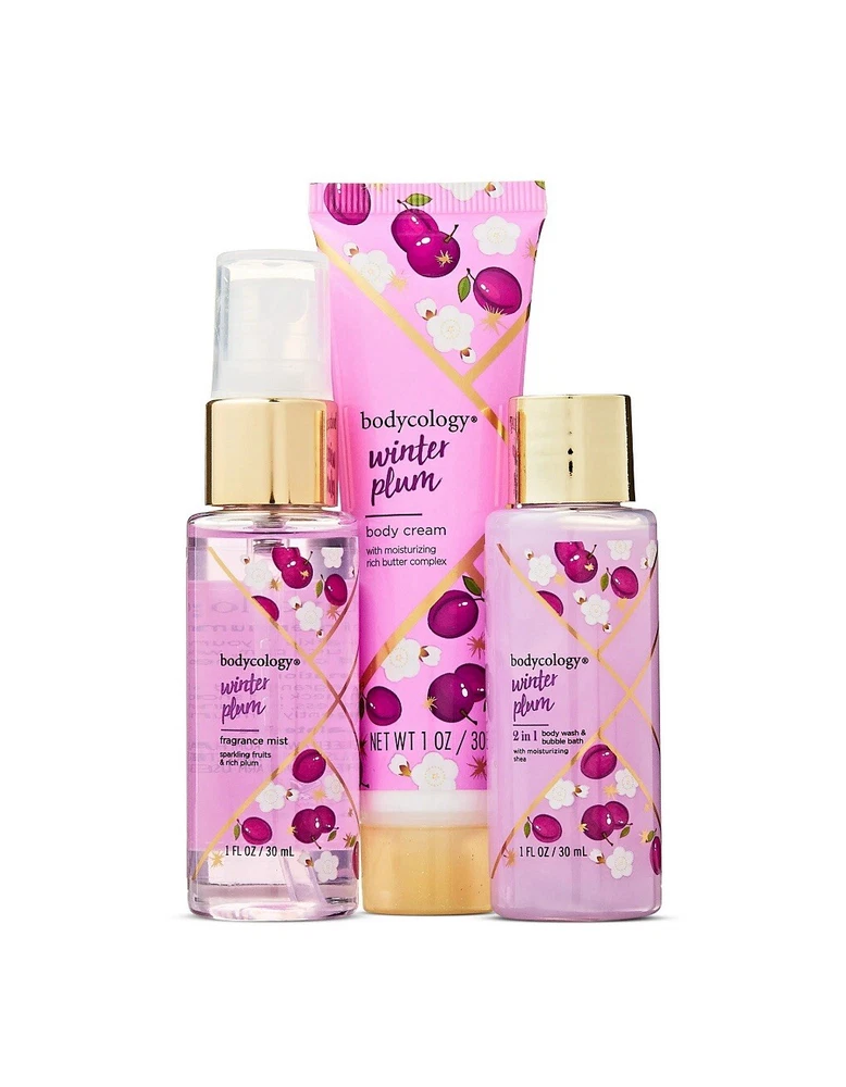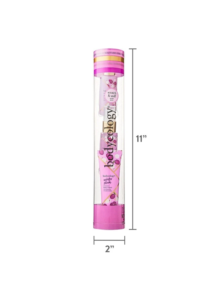 Bodycology Winter Plum Stocking Stuffer, 3 Pieces Includes fragrance mist, body cream, and 2-in-1 body wash and bubble bath Add a fresh sparkle to your winter with notes of juicy plum, white florals, and champagne Bodycology body cream moisturizes skin with a rich butter complex containing shea butter, cocoa butter and jojoba oil Bodycology fragrance mist is a long-lasting scent that will leave you smelling great and feeling fresh for hours 2-in-1 body wash and bubble bath is formulated with shea butter and vitamin E to deeply moisturize the skin, whether you use it as a body wash or a lovely bubble bath Paraben free, phthalate free, and never tested on animals Treat yourself or a loved one to the gift of relaxation