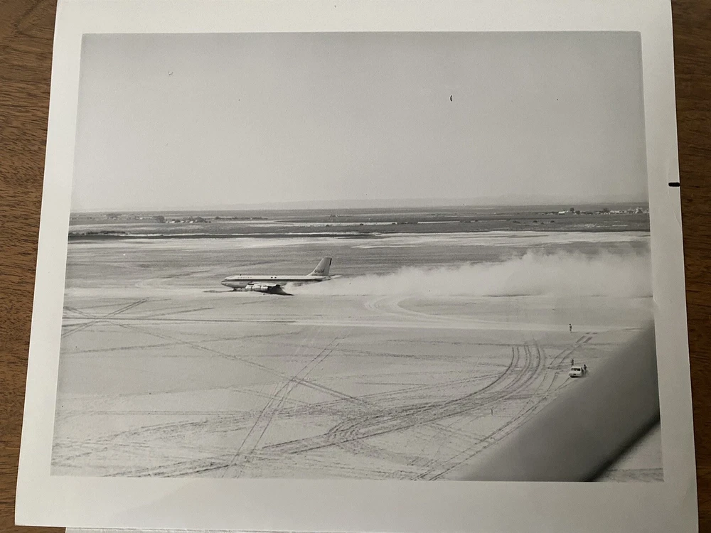 I acquired this original Boeing News Bureau photo from an estate sale of a past Boeing employee. The description of the photo says, "Taken from a light airplane over Harper Dry Lake, California, this photo shows the Boeing jet transport prototype during a takeoff run. The aircraft, equipped with soft-field landing gear recently completed a three-day test program in the area, demonstrating the feasibility be of operating large military jet transports into austere, support-type fields. Wheel tracks in the foreground indicate softness of terrain over which the 90-ton aircraft was operated. The lake bed is covered with a thin sun-baked crust beneath which is wet silt of the consistency of modeling clay." --Boeing Photo From : News Bureau The Boeing Company Seattle, Washington 98124 The back of the photo is stamped, "P36714" It's in very nice condition with a very slight crease on the right border.