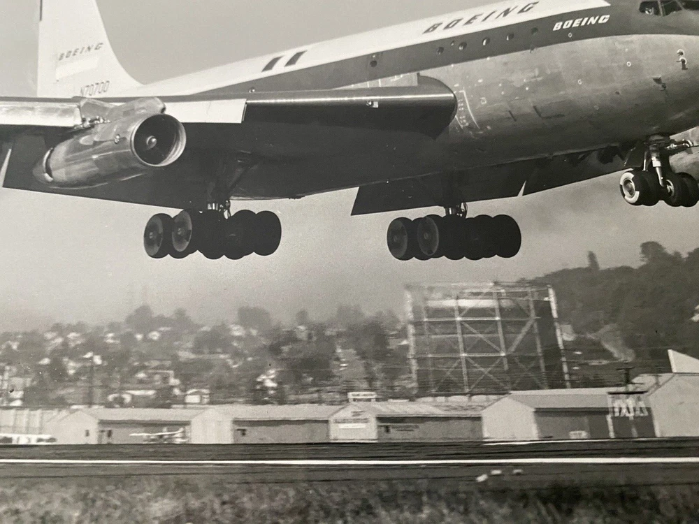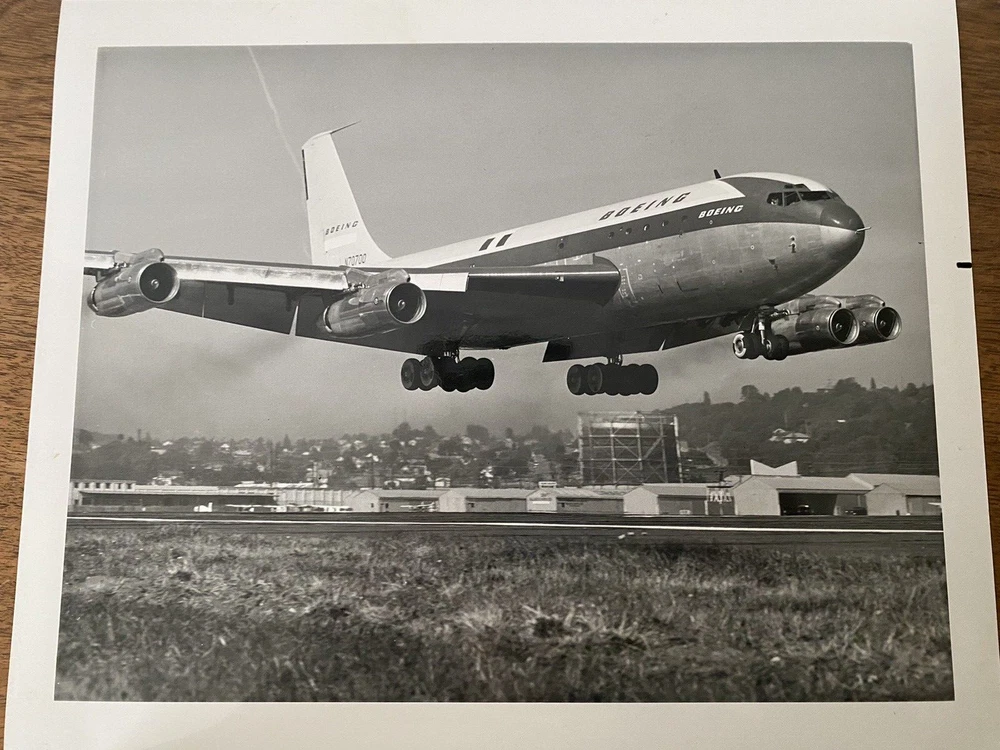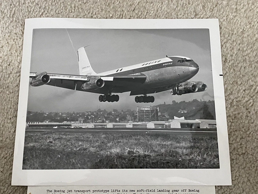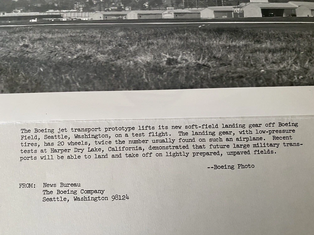 I acquired this original Boeing News Bureau photo from an estate sale of a past Boeing employee. The description of the photo says, "The Boeing jet transport prototype lifts its new soft-failed landing gear off Boeing Field, Seattle, Washington, on a test flight. The landing gear, with low-pressure tires, has 20 wheels, twice the number usually found on such an airplane. Recent tests at Harper Dry Lake, California, demonstrated that future large military transports will be able to land and take off on lightly prepared, unpaved fields." --Boeing Photo From : News Bureau The Boeing Company Seattle, Washington 98124 The back of the photo is stamped, "P 36694" It's in very nice condition. There is a spot on the paper attached to the photo.
