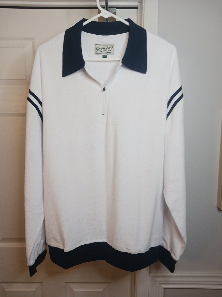 Brand: Bogey Boys Performance/Activity: Golf Collar Style: Spread Type: Polo Department: Men Size: L Fabric Type: Terry Material: 100% Cotton Size Type: Regular Fit: Regular Neckline: Crew Neck Closure: Zip Color: White Features: 1/4 Zip Garment Care: machine wash hang dry Occasion: Casual, Activewear Sleeve Length: Long Sleeve
