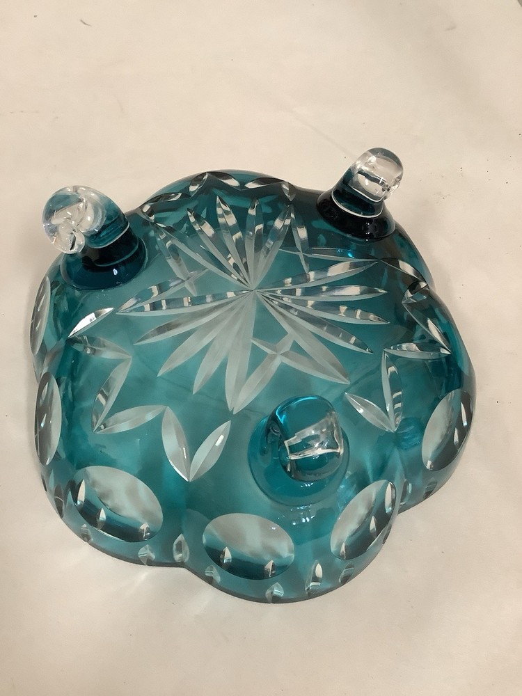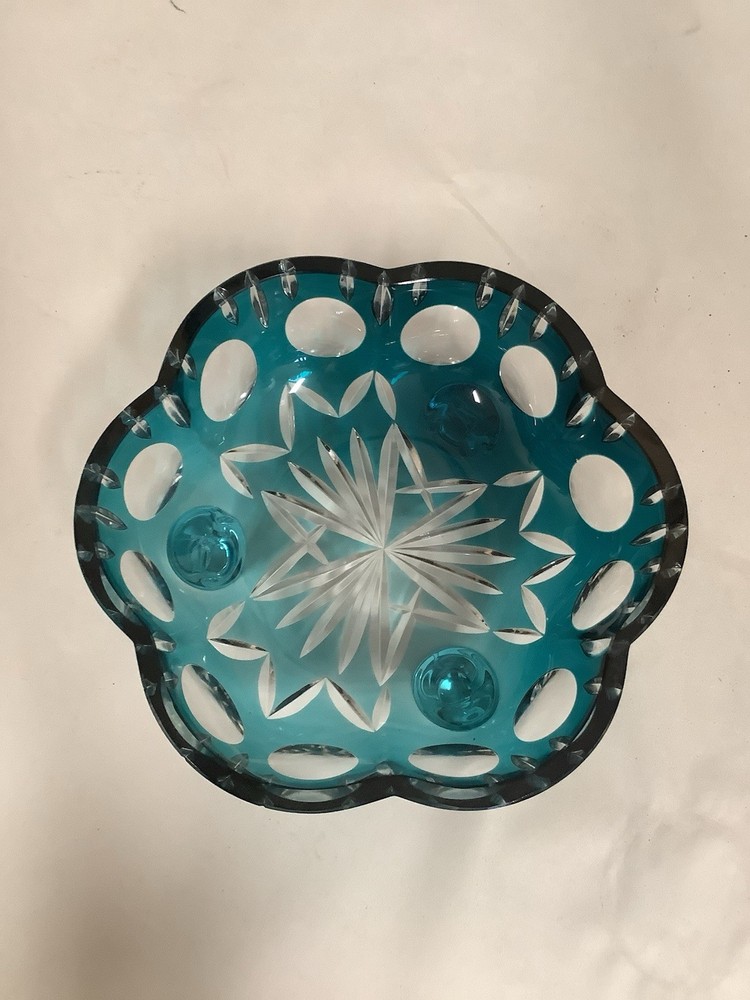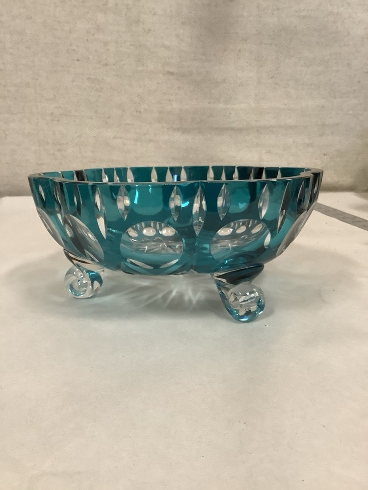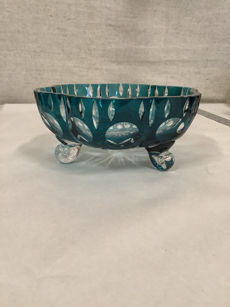 Really cool heavy crystal bowl footed Greenish blue to clear See photos