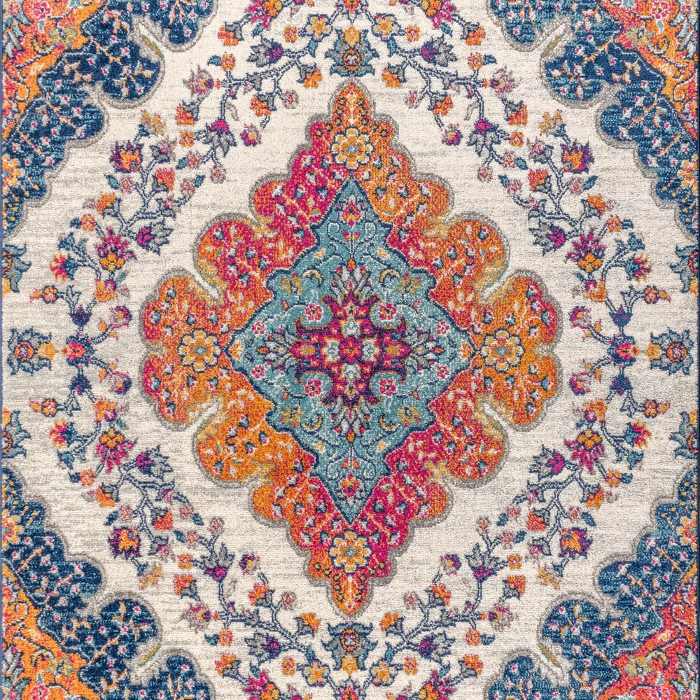 Boho chic in a color palette that would suit an urban retreat or beach bungalow, the modern coloration of this classic design is a statement maker in any space. Power loomed using the softest polypropylene available, its durability its beauty. Try it in a living space for added interest, or in a bedroom to mitigate noise and add a cozy feel. PET-FRIENDLY AND DURABLE: Durable for high-traffic areas, soft and comfortable area rug perfect for families with ; Low-pile synthetic rug fibers won’t trap dirt and debris, so they’re pet-friendly and easy to clean STAIN-RESISTANT AND NON-SHEDDING: This rug is made from synthetic fibers that are water resistant, stain resistant; It’s been machine-woven so the rug fibers will stay put; When properly cared for, this rug won’t shed fluff into your home EASY TO CARE FOR: Vacuum regularly; Always raise or turn off the beater bars on your vacuum; Spot clean stains immediately with a mild detergent or carpet cleaning product, then rinse thoroughly and blot dry; Professional rug cleaning is recommended With a plush pile cut at 0.31", it can stand up to high traffic without looking matted or worn Combining tones of pink, blue, orange and gold, this rug is a versatile addition to any color scheme