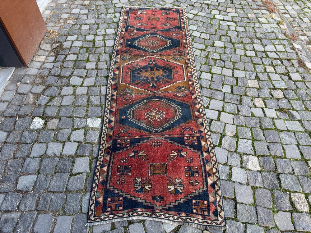 An old (approximately 45-60 years old) hand knotted / hand woven Turkish rug from the Middle Anatolian Region and made of genuine, high quality wool, in natural colors. Our distinguished Antiques and Vintage rugs, each with its own unique story, have been carefully selected from every corner of Turkey. RUG DETAILS * One-of-a-kind vintage rug * Dimensions: 2,6 x 8,5 ft = 33 x 103 inc = 82 x 262 cm * Low pile: approximately 0.2"(0.5 cm) * Dyed with natural dyes * Product code : RR 1889 SHIPPING * Free shipping on all items. * Usually shipped via FedEx or UPS. * Item will be ready for shipment within * Estimated delivery 3-5 business days 1-3 business days with a tracking number. All of our rugs have been professionally cleaned and ready to ship before being listed. These unique vintage rugs have normal wear related to their age. We believe this adds to the authenticity of these hand-woven beauties. We inspect all rugs carefully before Shipping, but in the unlikely event that due to our fault, the goods are not fit for purpose, damaged/defective, or we ship the wrong item, we will issue a 100% refund. We are a team of experienced professionals who are dedicated to ensuring your items arrive safely. Please note that our photos accurately represent the colors of the rug, however it may look different in the light in your home or against different colored floors. We are so excited to share the beauty and art of rugs with you and to see how your personal spaces transform! I do my best to build a great experience in online rug shopping for you, just look at the reviews. Please feel free to write me over conversation if you have any questions about the rug or price. I will be happy to answer to you. Thank you, Yusuf.