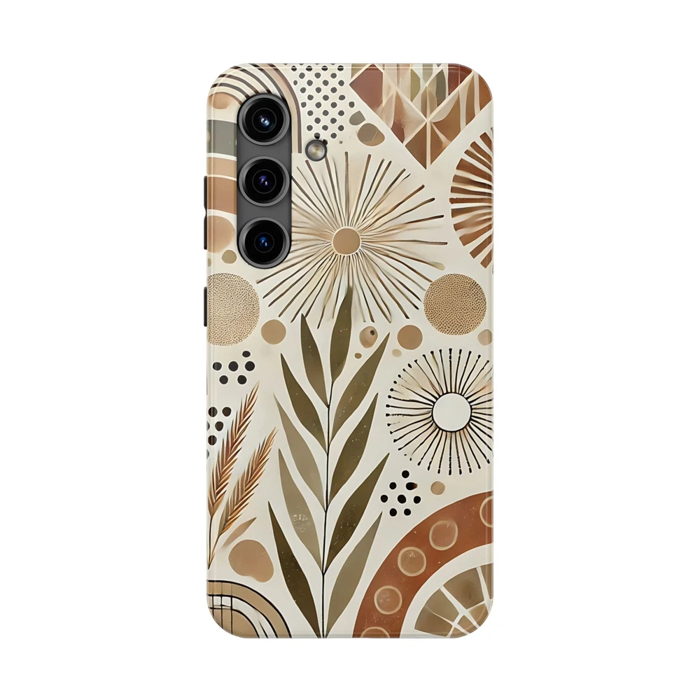 "Boho Chic Mosaic" blends modern bohemian style with a natural earth-toned palette, featuring a mix of geometric shapes, botanical elements, and abstract sunbursts. Protect your phone in custom style with this tough phone case. This lightweight phone case is impact-resistant thanks to its TPU lining and Polycarbonate shell. Meanwhile, the interior rubber liner adds an extra layer of protection to your phone for total peace of mind. Compatible with iPhone and Samsung smartphones. Check sizes for all available phone models. (iPhone 16 model now available). .: Materials: polycarbonate (shell), TPU (lining) .: 2-piece design with impact resistance and shock dispersion .: Interior rubber liner for extra protection (appearance may vary across phone models) .: Glossy finish .: Supports wireless charging (not including MagSafe)
