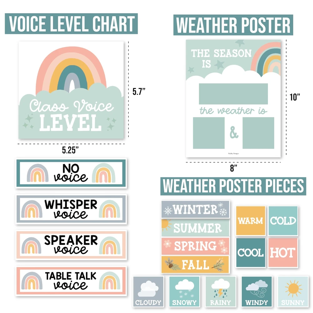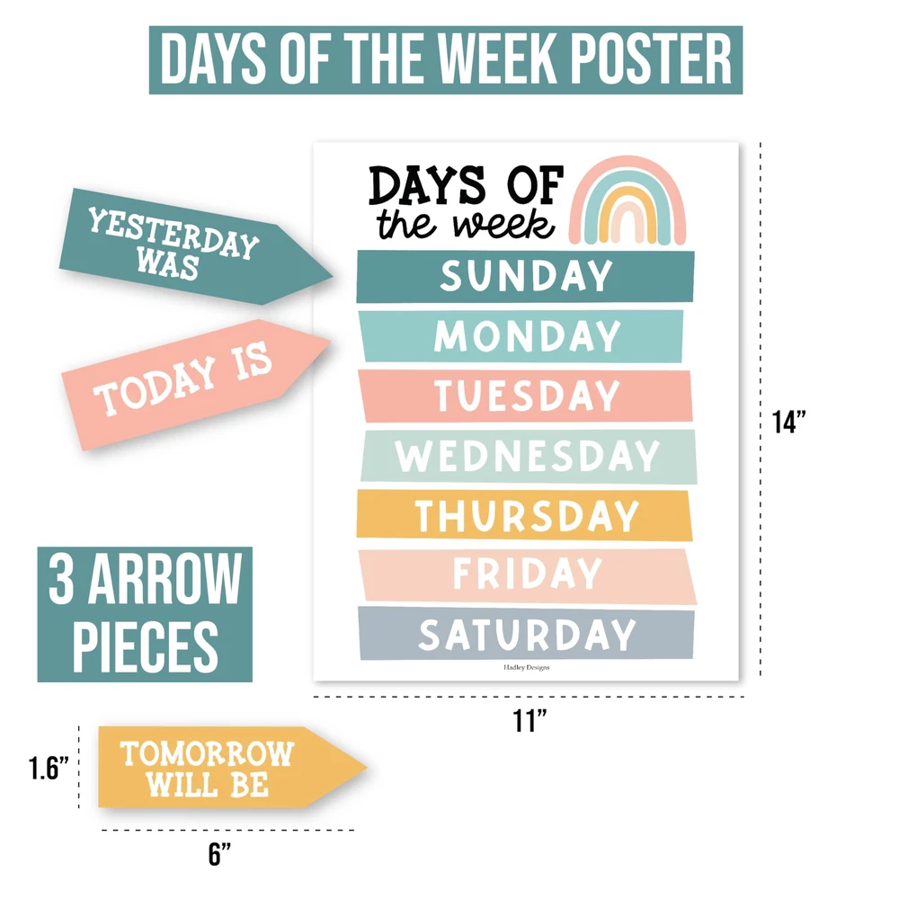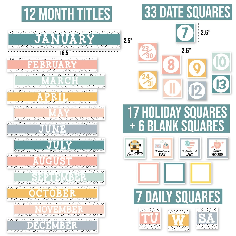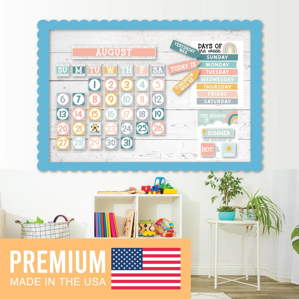 Looking to add some excitement to your classroom? Look no further than these classroom bulletin board sets! They're not only fun and engaging, but also an excellent circle time activity that fosters a lifelong love for learning. Package Includes: 98 Individual Calendar Pieces 1 - 11x14" Days Of The Week Poster 1 - 8x10" Weather Chart This calendar bundle includes everything needed to teach days of the week, months, weather, and more! Our calendar poster for classroom also captures kids' attention with their bright colors, so your students can learn (and retain!) new topics in record time. And unlike other classroom calendar numbers that are made overseas, our class calendar/classroom themes decoration sets are USA made with thick cardstock, so these classroom decor theme sets can be used year after year. Give students daily calendar practice by using this as a simple rainbow color voice level chart, pastel yellow green bulletin board months of the year, blue red doodles preschool classroom must haves, weather chart for preschool, school calendar for classroom elementary teacher must haves, calendar classroom must haves for teachers elementary, class calendar numbers for classroom, teacher calendar for classroom decor theme sets, homeschool calendar for school, kindergarten calendar for classroom decorations for teachers elementary, calendar set for classroom elementary classroom must haves, bulletin board decorations for classroom essentials for teachers elementary, calendar preschool classroom must haves, kindergarten classroom must haves, prek classroom essentials, 2nd grade classroom must haves. Our family-owned business wants to help you create a fun learning space. If you have questions about our classroom must haves, classroom essentials, teacher supplies for classroom, or our preschool classroom supplies, please don't hesitate to reach out. If You’re Looking To Make Circle Time Educational And Fun; Then you need this modern boho calendar set for classroom elementary; While other calendar classroom are made overseas, our preschool classroom calendar set is proudly USA made Get Kids Excited About Their Day; You'll receive 98 individual calendar pieces, 1 - 8x10 weather chart, and 1 - 11x14 days of the week poster; Inspire a love for learning with this muted tones school calendar for classroom elementary/teacher calendar for classroom Capture Attention And Boost Focus; This bright colorful calendar numbers for classroom helps grab and hold kids' attention; Skyrocket learning speed and retention with this classroom decorations, classroom wall calendar, months of the year bulletin board set Sharpen Critical Thinking Skills; Use as a bohemian homeschool calendar, kindergarten calendar for classroom, voice level poster for classroom, weather chart for classroom, months of the year for classroom, bulletin board decorations for classroom