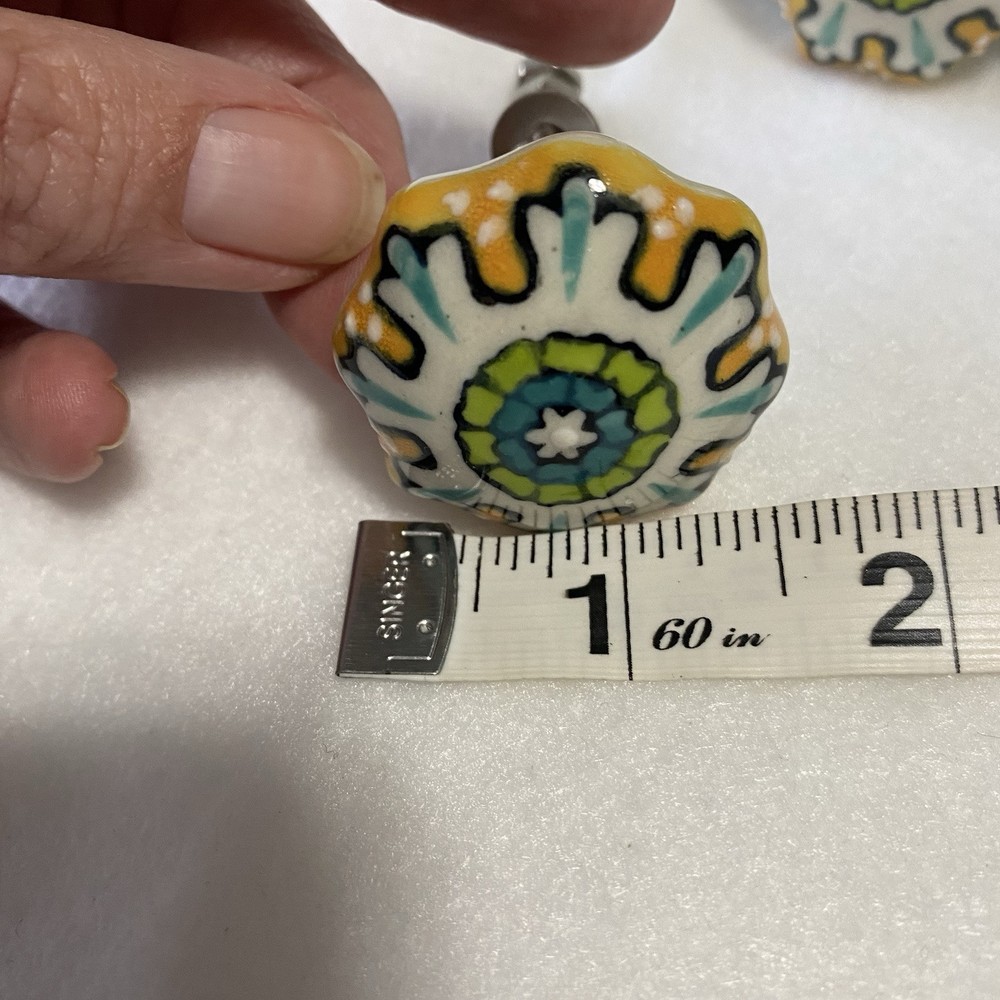 Replacement refinishing furniture drawer pulls cabinet knobs painted boho indie Whimsical colorful hand painted pattern ceramic knobs Yellows greens blues Set of 12 New without tags Cabinets or furniture knobs Indie cottage boho colorful whimsical Anthro painted pattern ceramic porcelain knobs drawer pulls furniture cabinet set