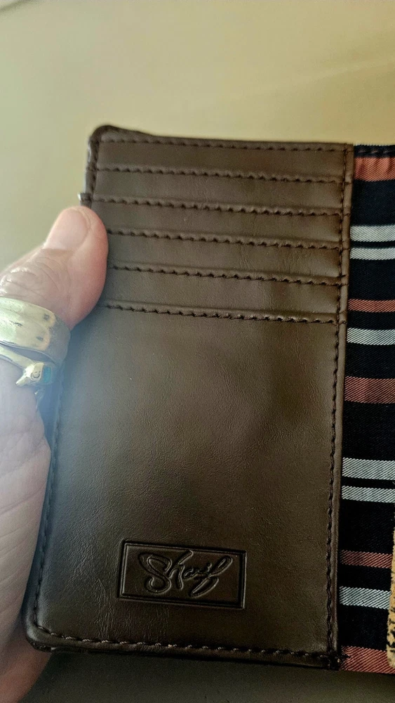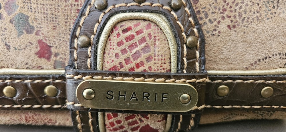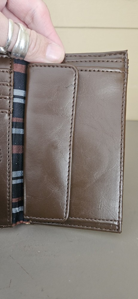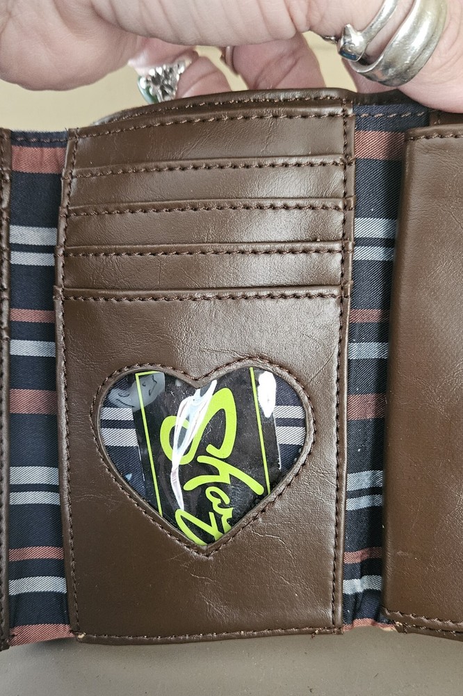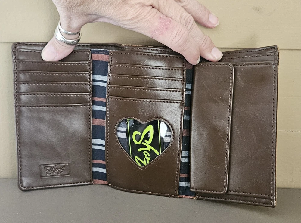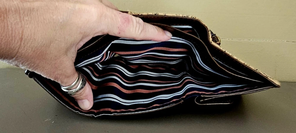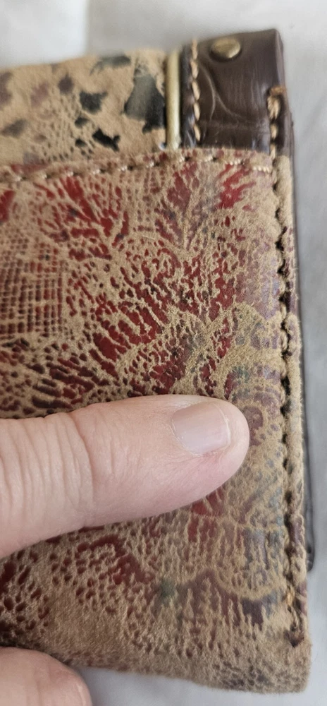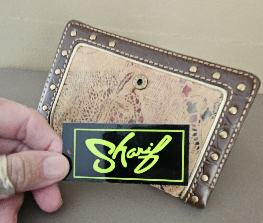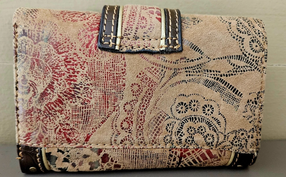 Estate sale find...original tags still inside but there is some minor scuff marks from storage, tried to show in last photo, nothing big, but had to mention. Super soft bohemian style floral print with a brown croc embossed trim , and bronze metal studs. Inside fabric is a multicolor navy striped pattern. Has a cute heart shaped clear pocket Measures closed - 5.5" x 4" Measures open - 10" x 5.5" Lots of pockets!! Please see pictures for best description