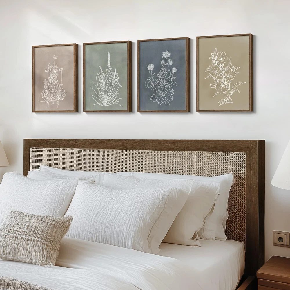 [Framed Wall Art]: A set of 4 boho vintage framed floral wall art prints with simple and rustic patterns, each measuring 12x16 inches. The frame is made of durable, rust-proof metal with a dark wood veneer on the surface to simulate real wood texture. [Canvas Art Wall Decor]: Our artwork is made of waterproof canvas, which is moisture-proof and easy to maintain. This canvas has a unique texture that can enhance the visual effect of the image and make the color more saturated, which can keep the color of the painting bright for a long time and is not easy to fade or damage. [As Great As The Picture]: The background color of this set of artworks is selected from soft earth tones such as beige, light green and dark blue, giving a calm feeling. The dark wood frame adds a rustic charm, combined with the line drawing plant pattern, creating a yet modern visual effect, and it is also easy to match with other furniture and decorations. Perfect for hanging in various rooms such as living room, bedroom, bathroom, dining room, study or office area. [Ready to Hang]: Each painting is framed for you. After receiving it, you can hang it up and decorate your beautiful home very easily and conveniently. [Gifting]: This set of bohemian style rustic botanical wall art prints are perfect for your new home decoration, or you can also give them to your relatives and friends when they move into a new home.