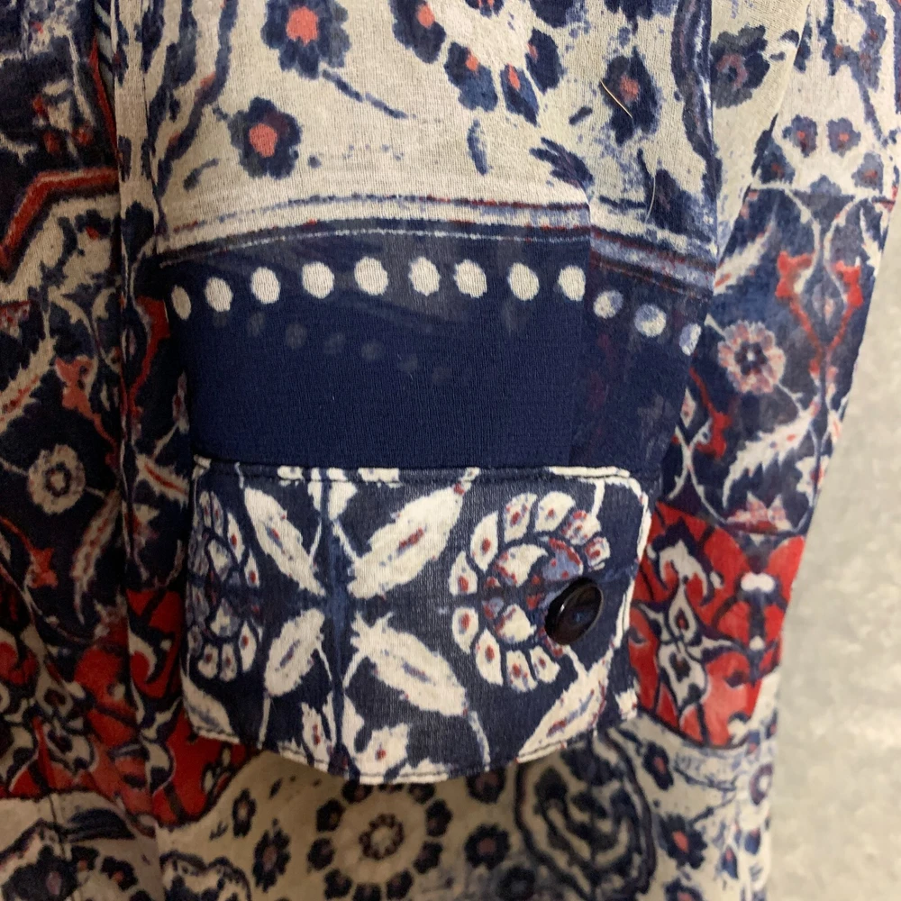 Fit: Regular Material: Polyester Brand: One World Garment Care: Machine Washable Sleeve Length: Long Sleeve Handmade: No Vintage: No Theme: Bohemian, Hippie Size Type: Regular Pattern: Floral Occasion: Casual Features: Lightweight, Sheer Size: S Department: Women Sleeve Type: Roll Tab Sleeve Type: Blouse Closure: Button Fabric Type: Chiffon Neckline: High Neck Color: Multicolor Style: Tunic Personalize: No