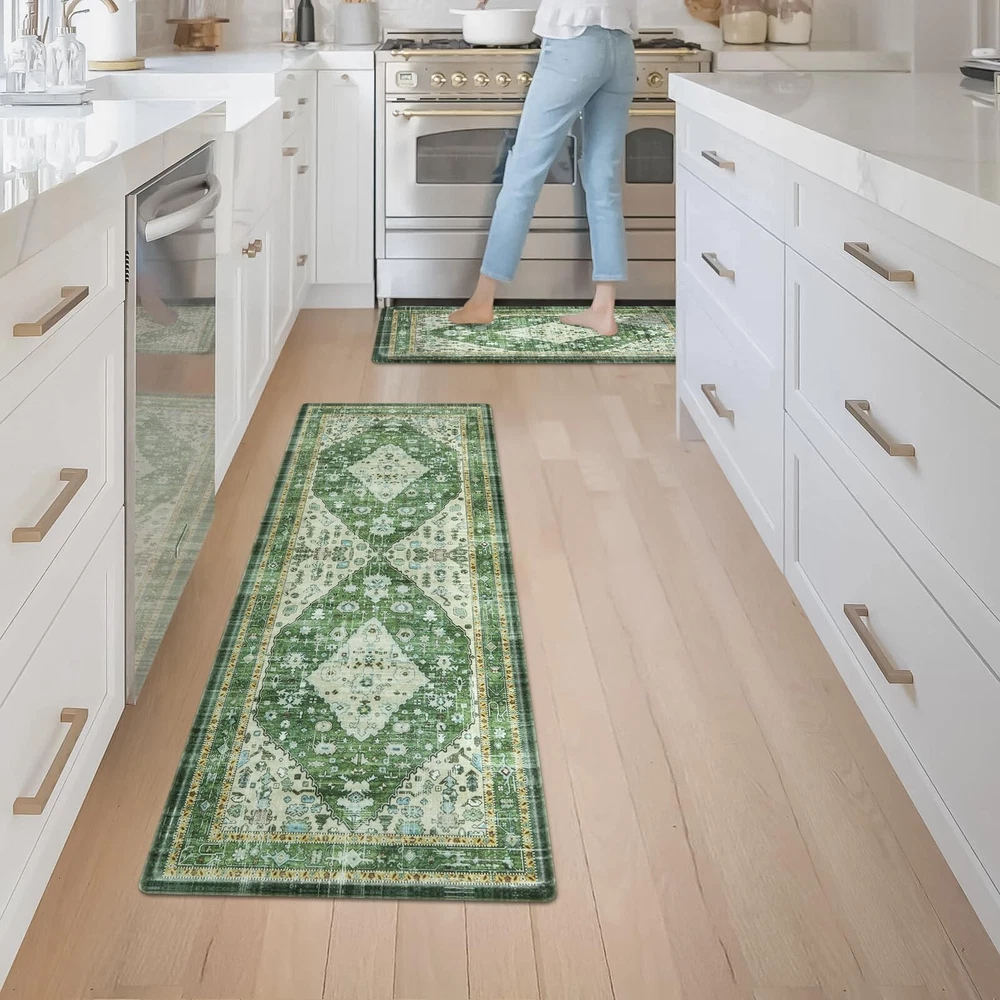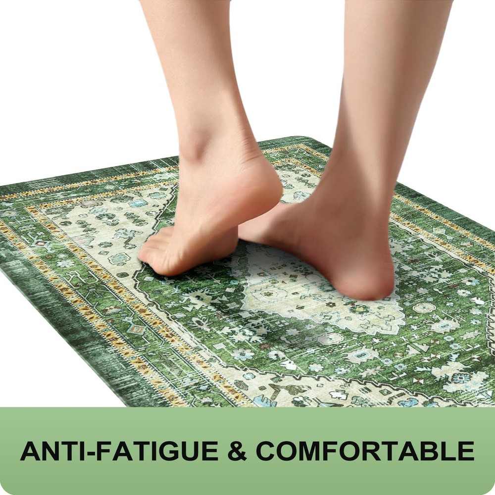 Collive Boho Kitchen Mat, Cushioned Anti Fatigue Kitchen Rug Set 2 Piece Non-Skid Waterproof Kitchen Mats for Floor, Comfort Heavy Duty Standing Mat for Kitchen, Laundry, Sink, Office, Desk Product Details Color: Green Size: 17.3"x59"+17.3"x30" Brand: Collive MPN: Does not apply UPC: Does not apply EAN: Does not apply Brand: Collive Size: 17.3"x59"+17.3"x30" Material: PVC Weave Type: Machine Made Pile Height: Low Pile Brand: Collive Size: 17.3"x59"+17.3"x30" Material: PVC Weave Type: Machine Made Pile Height: Low Pile Construction Type: Machine Made Back Material Type: Polyvinyl Chloride Color: Green Indoor/Outdoor Usage: Indoor Theme: Christmas Is Stain Resistant: Yes Product Care Instructions: Spot Clean Only Pattern: Tribe Shape: Runner Special Feature: Waterproof, Non Slip Room Type: Laundry Room, Kitchen, Bedroom, Home Office Product Dimensions: 59"L x 17"W Rug Form Type: Runner Style: Boho Occasion: Housewarming Number of Pieces: 2 Item Thickness: 0.47 Inches Water Resistance Level: Waterproof Is Autographed: No Age Range (Description): Adult Item Weight: 6.23 pounds Country of Origin: China Date First Available: November 20, 2023 Anti Fatigue & Comfort: The kitchen anti-fatigue mat set includes 2 pieces of 0.47" thick kitchen floor mats cushioned. Made of soft foam construction are designed to provide maximum comfort, giving tired toes rest and making cooking easier for you Easy Care & Waterproof: Our kitchen mats for floor are waterproof, oil-proof and sturdy, simply wipe clean with a damp sponge or cloth, use any common household cleaner or sweep clean of dirt and dust, to save your time and energy Non Slip & Safety: The top of the kitchen mats cushioned is designed with a texture while the bottom is made of non-skid material, anti-fatigue kitchen matts floor provides superior traction on any surface, preventing from slipping or falling Boho Tribe Kitchen Mat: Add a touch of boho vibe to your kitchen with an Oriental pattern in delicate hues. The anti-fatigue kitchen mats feature a beautiful floral medallion with classic tribal elements, enhance the aesthetic appeal of your kitchen Versatile & Decoration: Great choice for kitchen, bathroom, laundry, bedroom, office, desk, and more. With a wide selection of sizes and patterns, our kitchen mat set of 2 adds decor to any room. Also surprise your family and friends at holidays