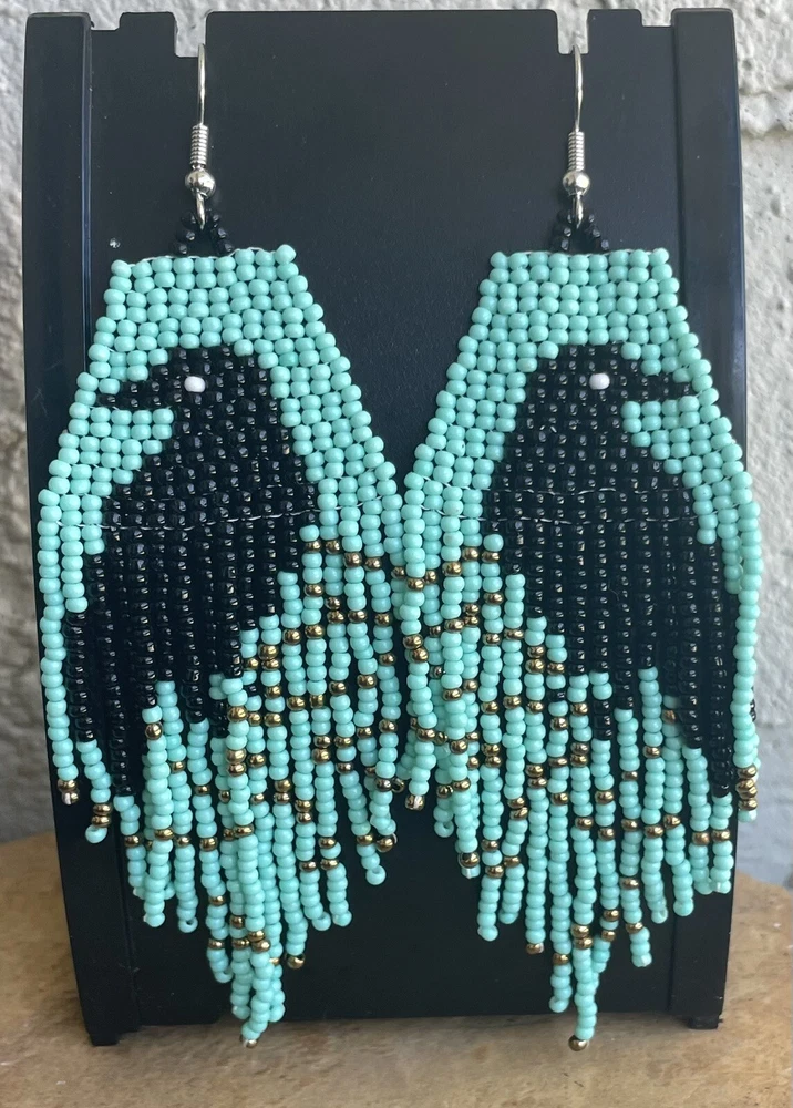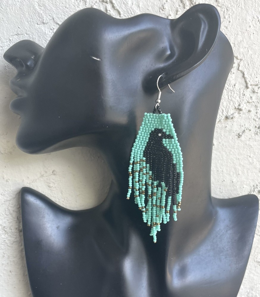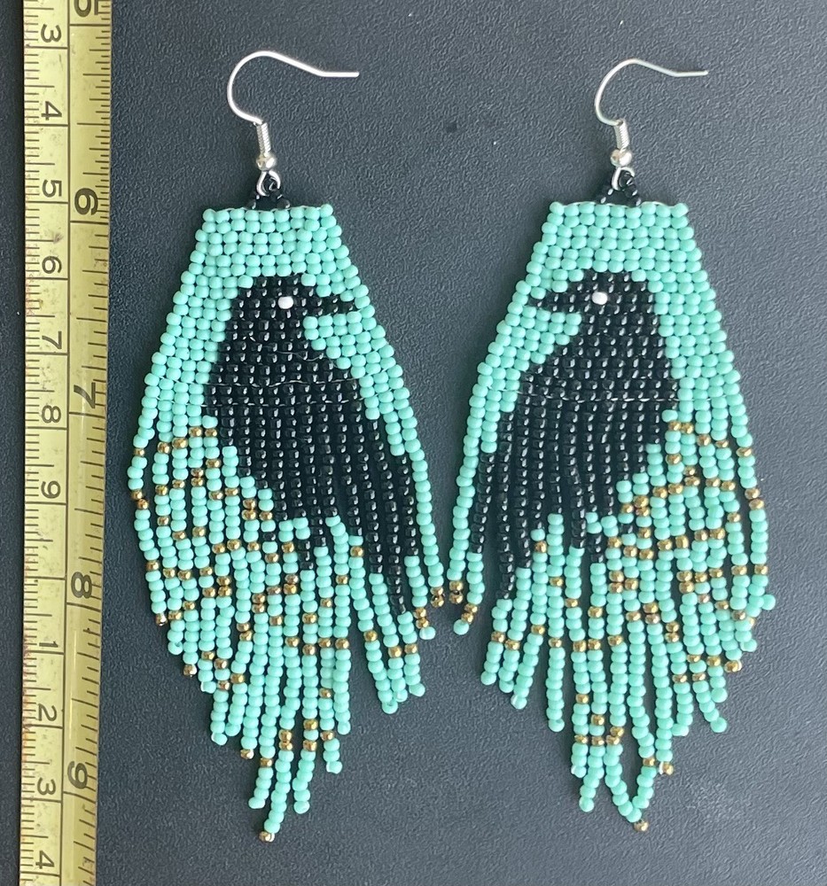 1 pair of long black bird and turquoise seed bead earrings. You will receive earrings pictured. The earrings are made with seed beads. The earrings are approximately 4" long with the ear hooks included. They are for pierced ears. 0-ea-seed-111-1