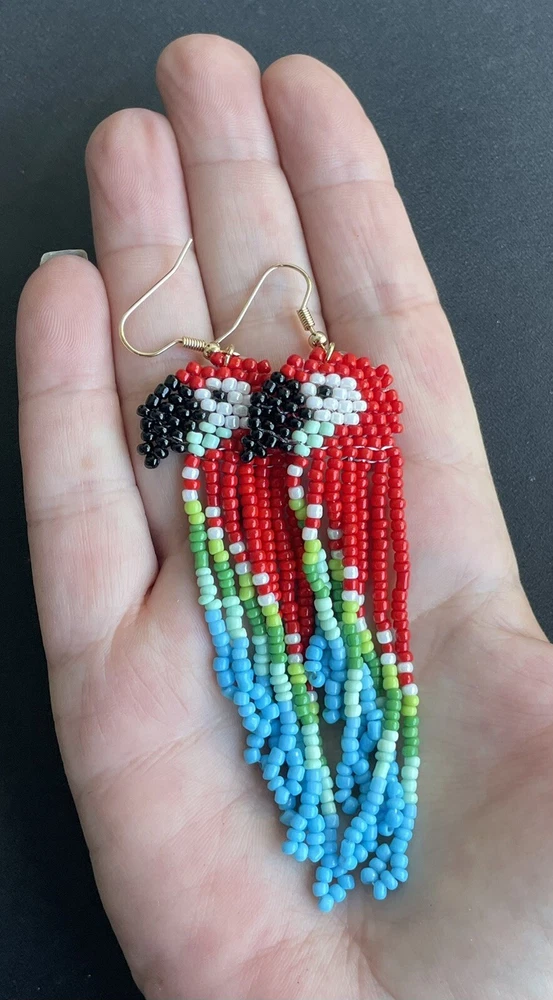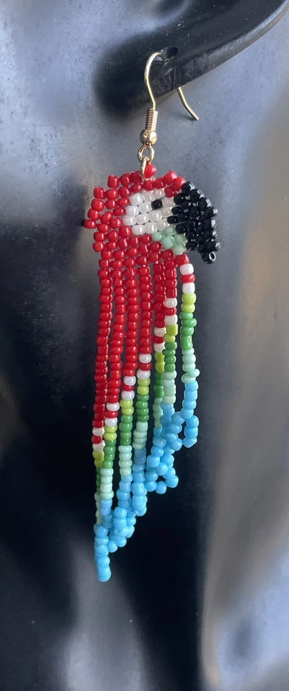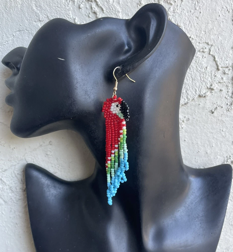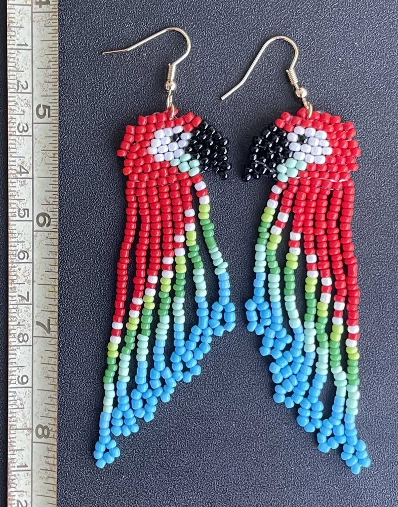 1 pair of long colorful red parrot seed bead earrings. You will receive earrings pictured. The earrings are made with seed beads. The earrings are approximately 4" long with the ear hooks included. They are for pierced ears. 0-ea-seed-036-1
