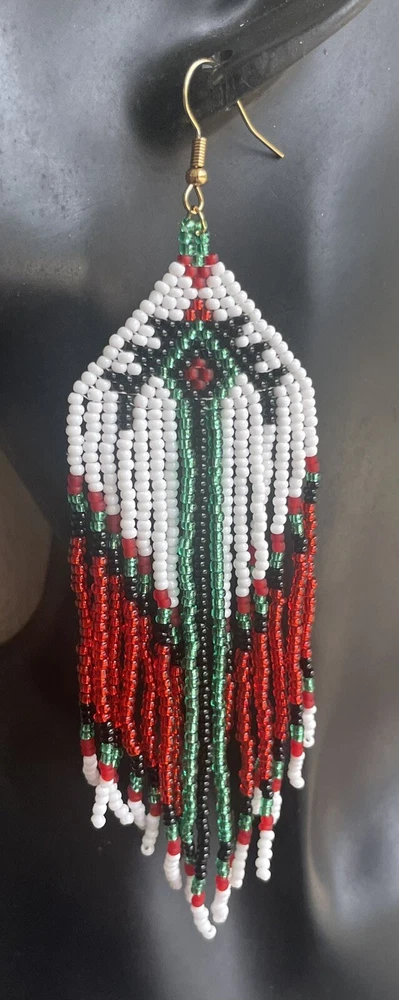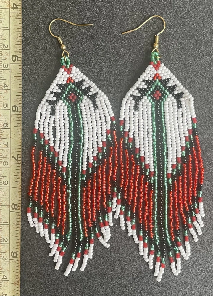 1 pair of long white, green and red seed bead beaded earrings. You will receive earrings pictured. The earrings are made with seed beads. The earrings are approximately 5 1/2" long with the ear hooks included. They are for pierced ears. 0-ea-seed-099-1