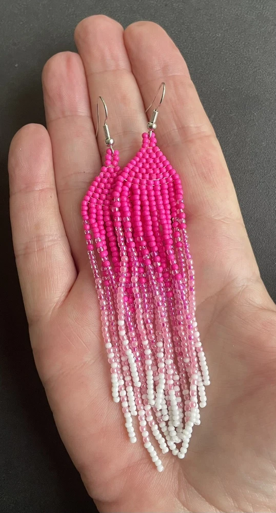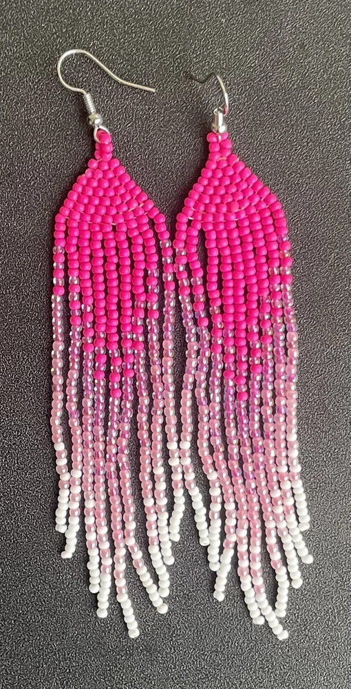 1 pair of pink and white graduated seed bead beaded earrings. You will receive earrings pictured. The earrings are made with seed beads.The earrings are approximately 4 1/4" long with the ear hooks included. They are for pierced ears. 0-ea-seed-259-1