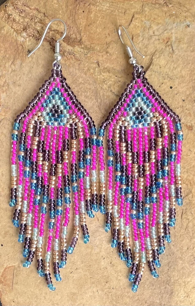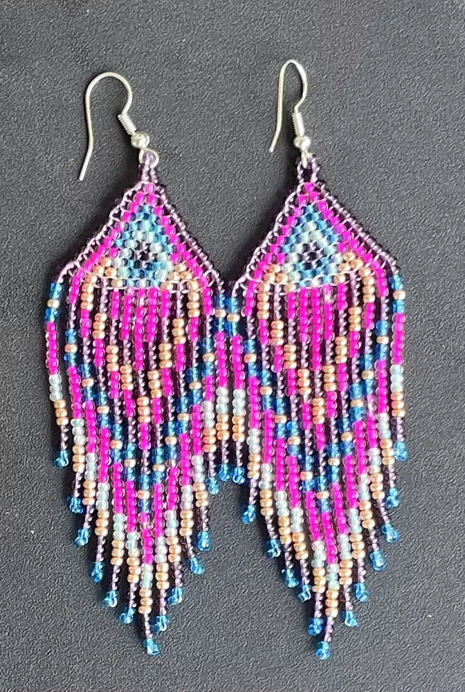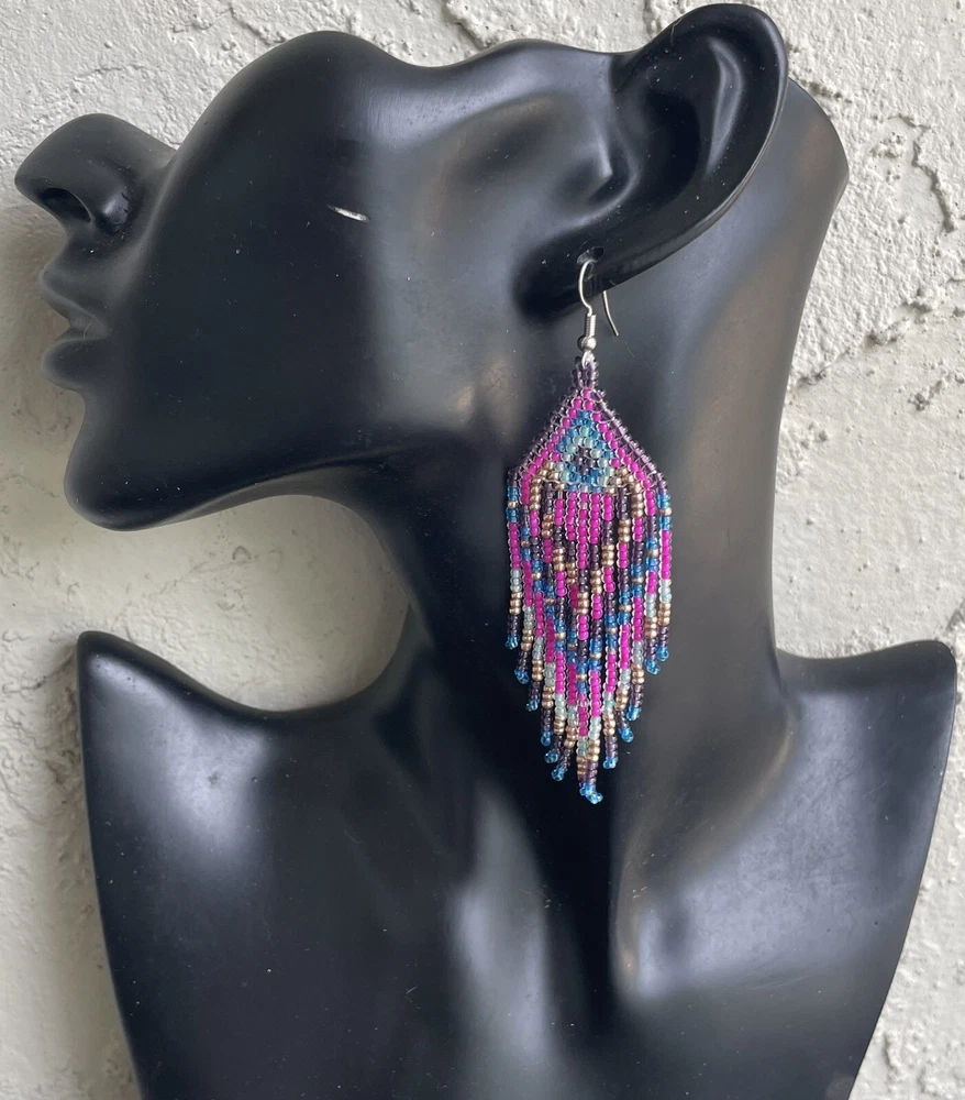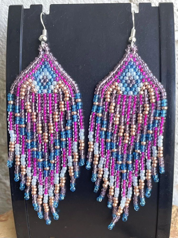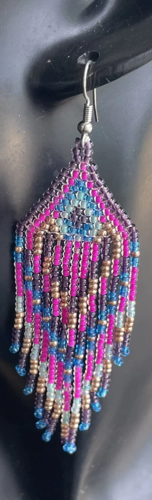 1 pair of pink, purple, blue and gold seed bead earrings. You will receive earrings pictured. The earrings are handmade with seed beads.The earrings are approximately 4" long with the ear hooks included. They are for pierced ears. 0-ea-seed027-1