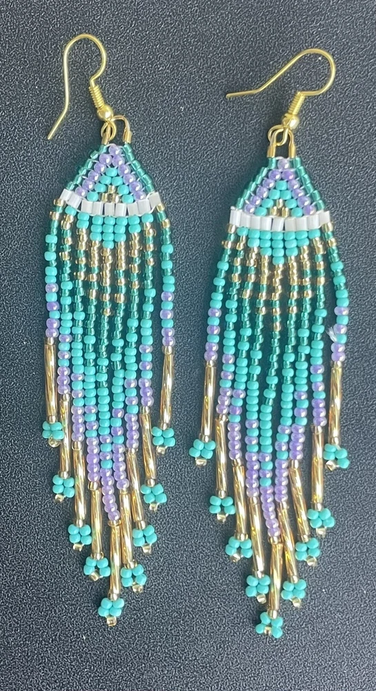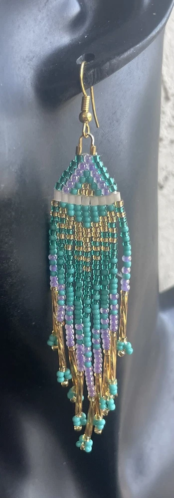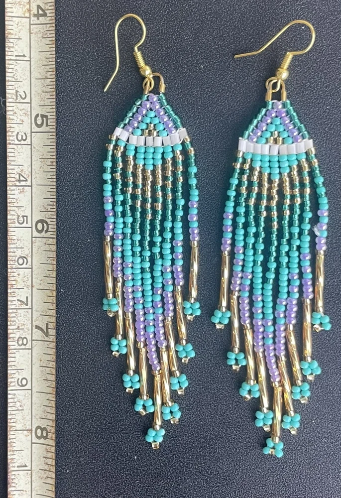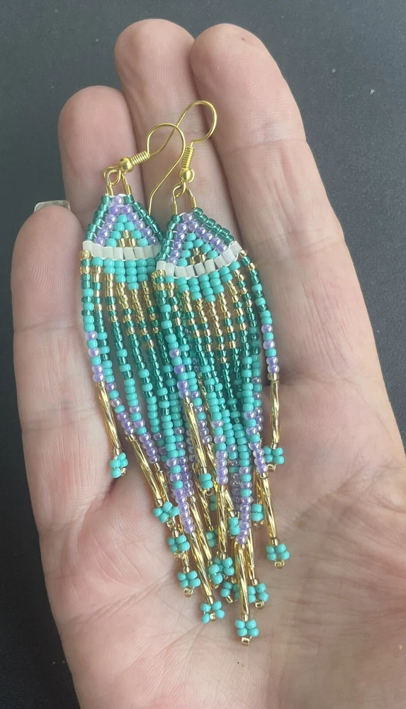 1 pair of handmade long turquoise and gold seed bead beaded earrings. You will receive earrings just like the ones pictured. The earrings are handmade with seed beads. The earrings are approximately 4 1/4" long with the ear hooks included. They are for pierced ears. 0-ea-seed-196-1