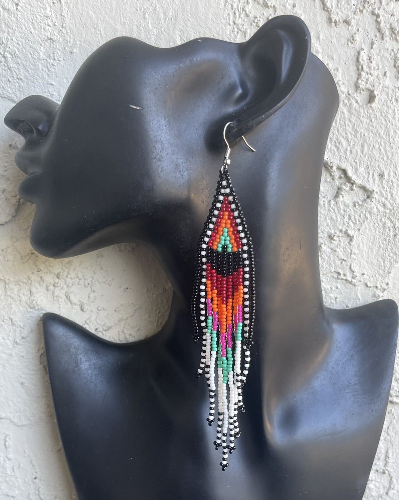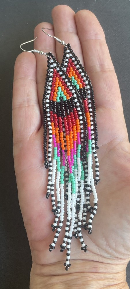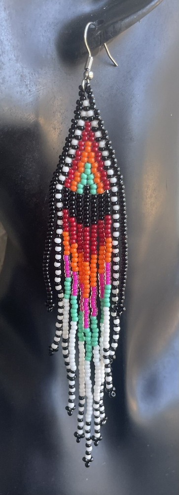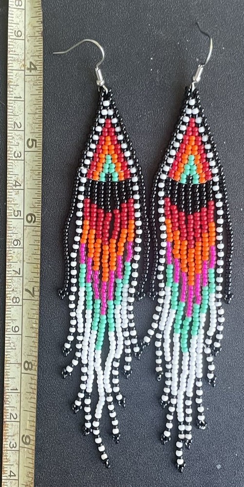 1 pair of long colorful multicolored tribal seed bead beaded earrings. You will receive earrings pictured. The earrings are handmade with seed beads. The earrings are approximately 6" long with the ear hooks included. They are for pierced ears. 0-ea-seed-254-1