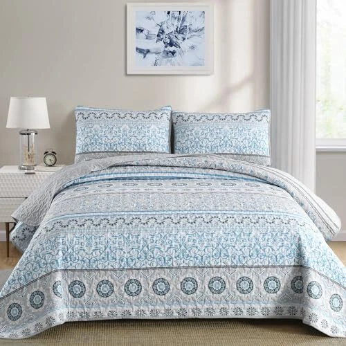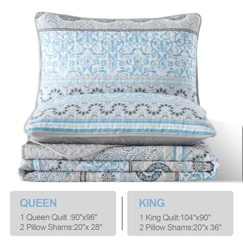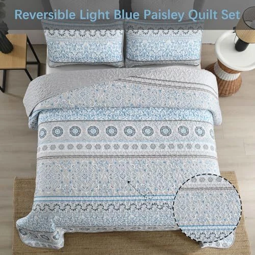 Return Policy Fast Delivery Trusted seller Light Blue Boho Quilt Set Queen 3 Pieces Striped Paisley Floral Quilt Coverlet Set Soft Microfiber Lightweight Bedding Quilt for All Season (Queen, 90"x96") Product Description Queen Size Quilt Set: 3 Pieces light blue paisley printed quilt set include 1 light blue quilt (90"x 96") + 2 pillow shams (20"x 28"). Neat and strong stitching of boho paisley bedspread will not tear, durable and allowing use for many years. High Quailty Material: Light Blue Paisley printed quilt set is made of super soft high quality lightweight breathable microfiber polyester, it is soft and cozy even after washing. Perfect gifts choice for your families and friends. Exquisite Boho Paisley Design: This light blue boho quilt set comes with an elegant and exquisite boho paisley pattern, with a modern and fashion design that can be used as a decoration for your bedroom or guest room. All Seasons Use: Boho paisley pattern quilt set is made for all seasons, especially in spring and summer. Use it as a quilt in spring and summer, and a bedspread coverlet set in autumn and winter. Easy to Care: Light Blue quilt set wash before use and machine wash cold on gentle cycle and separately from other colors, tumble dry on low heat, please do not bleach, do not dry clean. Shipping Returns Payment Shipping Shipping is FREE to all addresses other than APO/PO boxes in the lower 48 states. All our stock ships from US-based warehouses. Shipped via USPS or UPS (depending on location and package weight) Unless stated otherwise, all orders will ship within 24-72 hours of your payment being processed. Check our feedback to see the great reviews of FAST shipping we offer. Returns Seller does not accept returns Payment We currently accept payment via eBay managed payments only. Once payment is cleared, we will dispatch your shipment within 1-3 business days. Please refer to the "Shipping" tab for more information regarding shipping speed to your destination.
