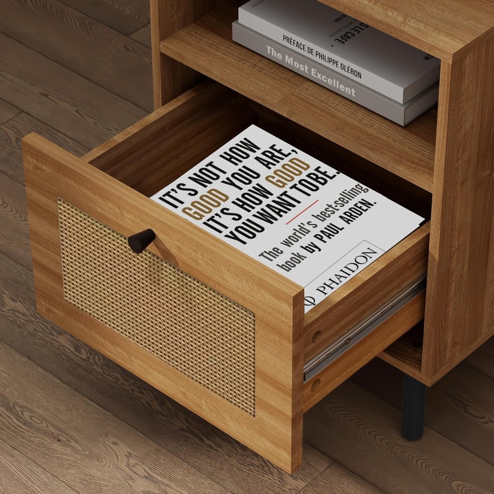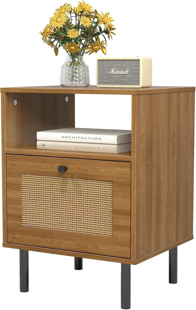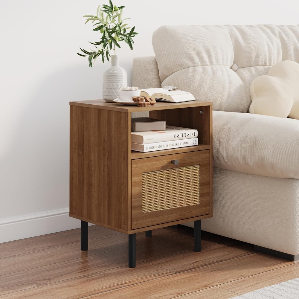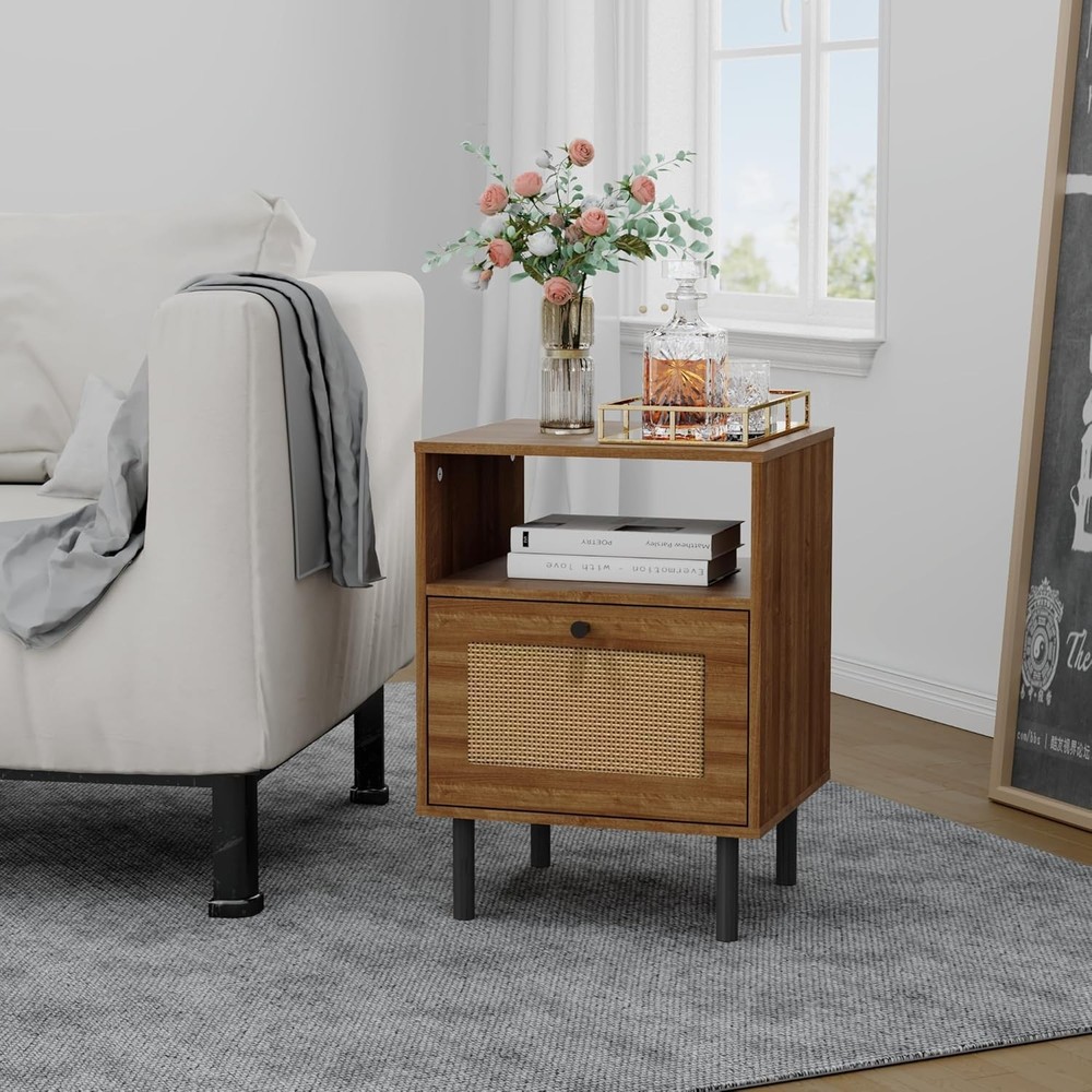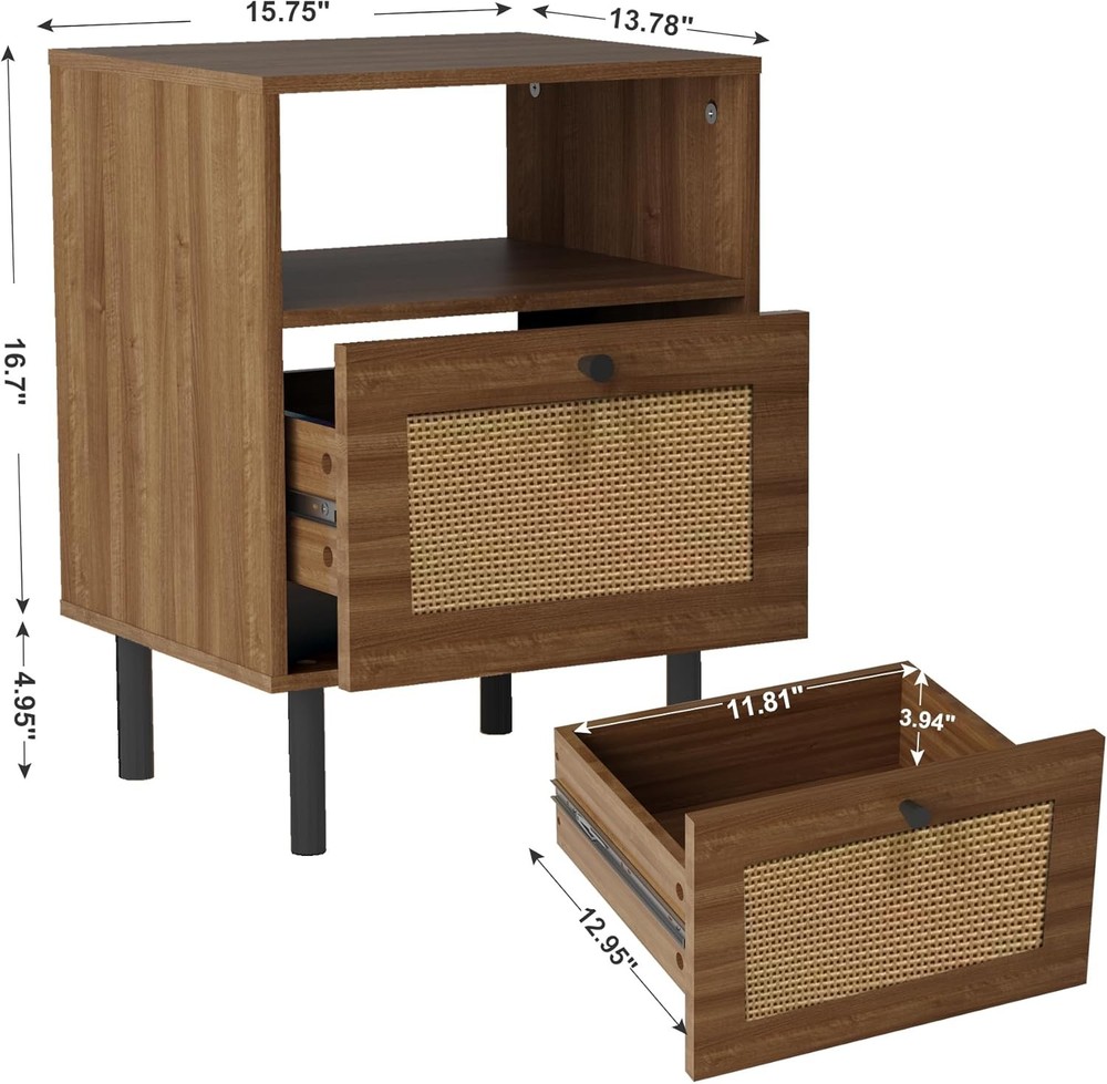 Rattan Nightstand, Bedside Tables with Drawer, Boho End Side Walnut Product Details Brand: DongRong Product Dimensions: 13.78"D x 15.75"W x 21.65"H Maximum Weight Recommendation: 22 Pounds Color: Walnut Base Type: Leg Item WeightFrame Material: 20.06 PoundsEngineered Wood Top Material TypeShape: Engineered WoodRectangular Premium Material:The Size is 15.8x13.8x21.7 inch,which is suitable for small space.Made of premium MDF, the wood end table is strong and sturdy enough to hold some daily items. And the Metal legs ensure stability and durability. Rattan Design: The wooden rattan bedside table combines modern and Boho styles, which can be integrated with a variety of decoration styles, and is very suitable for decorating and embellishing your warm home. Moreover, the drawers made of rattan material not only have storage functions, but are also very breathable and can keep air circulation. Versatile & Multi-scene:The nightstands not only as a bedside table but also as a side table, end table, accent table, or a small storage table. Perfect for various settings such as bedrooms, living rooms, study rooms, and dorm. Two-layer Capacity: The first layer is convenient for placing some frequently used items, and the second layer with a drawer, which can play a role in dust prevention and privacy protection, and is suitable for placing some more valuable things. Two designs meet your different needs. Easy Assembly: The nightstand comes with an assembly manual. You can refer to the video and the manual to assemble it. If you have any questions, please feel free to contact us. Skin-Friendly Material:Sustainable Rattan: Handwoven with natural cane, free from harmful chemicals, making it safe for kids and pets. Gentle Texture: Smooth rattan surface prevents scratches, unlike sharp-edged metal/glass furniture. Lightweight Yet Stable for Easy Rearranging: Easy to Move—— Lightweight design allows effortless repositioning in small spaces. Anti-Slip Pads:——Metal legs include protective pads to prevent floor scratches and reduce noise.