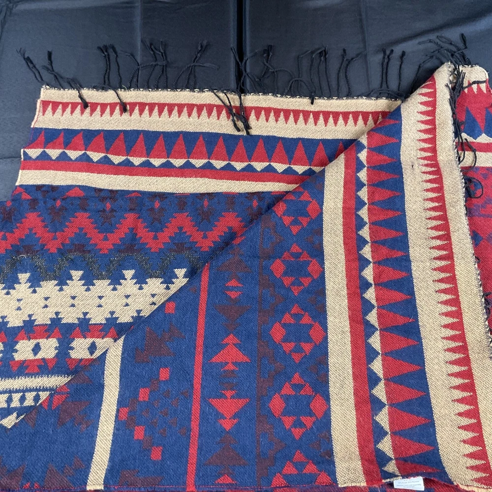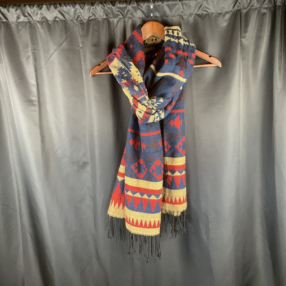 Boho western print polyester/acrylic blend blanket scarf with fringe. Made in China, one size, machine washable, dry flat. Very good preowned condition - please see photos for additional info.